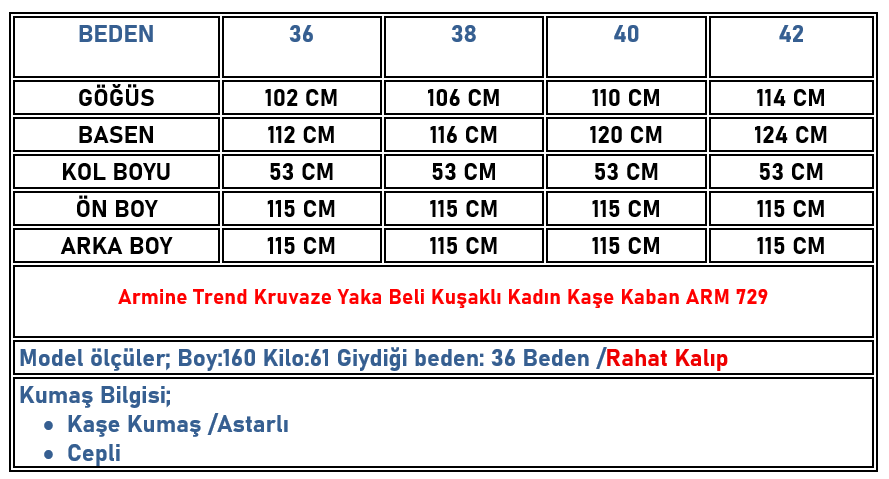 Armine Trend Kruvaze Yaka Beli Kuşaklı Kadın Kaşe Kaban Taş ARM 729 (ARM-26K729)