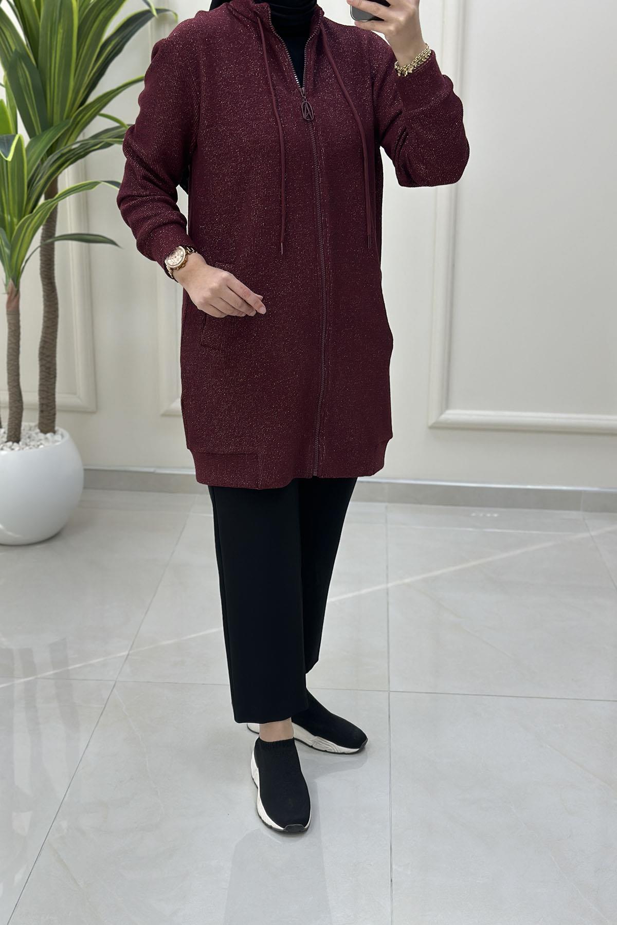 Armine Trend Önü Fermuarlı Cepli Kadın Örme Hırka Bordo ARM 555 (ARM-26K555)