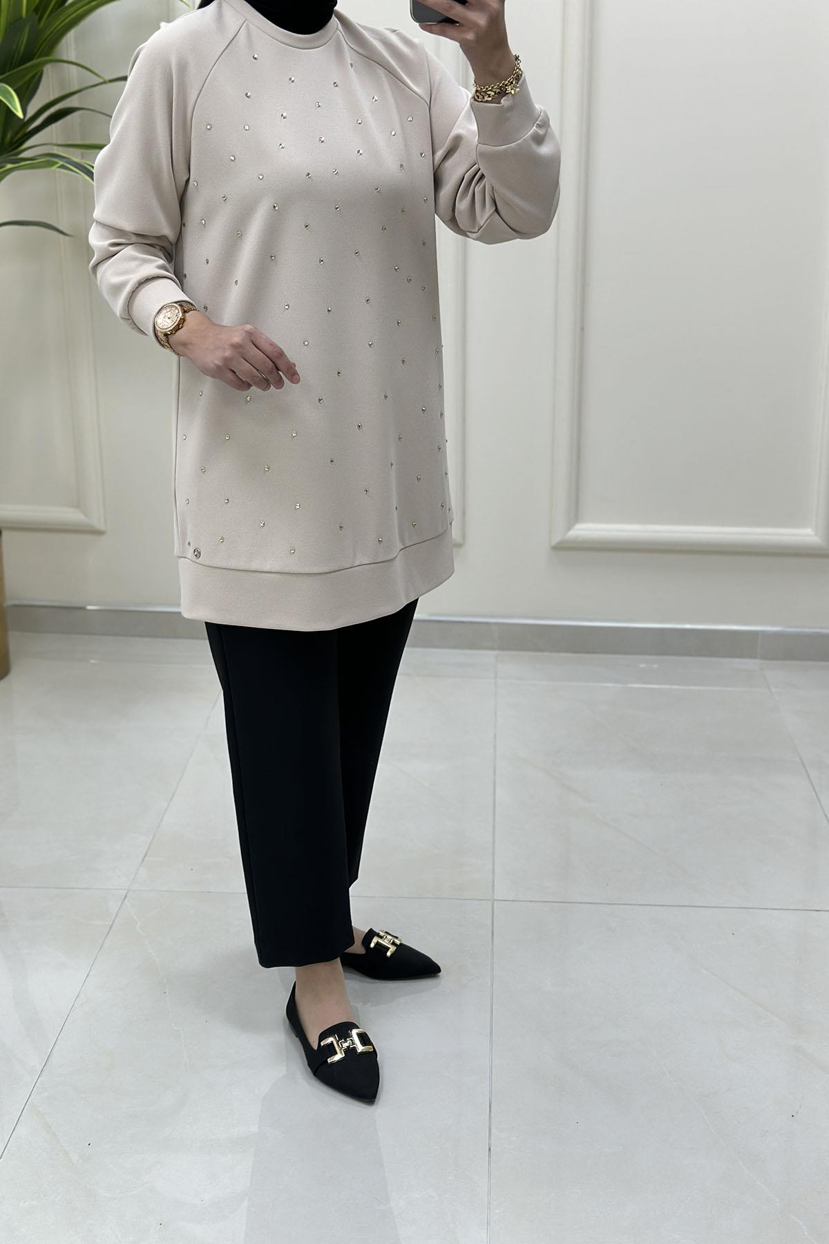 Armine Trend Reglan Kol Önü Serpme Taş Detaylı Kadın Tunik Bej ARM 449 (ARM-26K449)