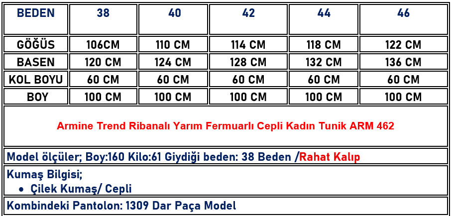Armine Trend Ribanalı Yarım Fermuarlı Cepli Kadın Tunik Lacivert ARM 462