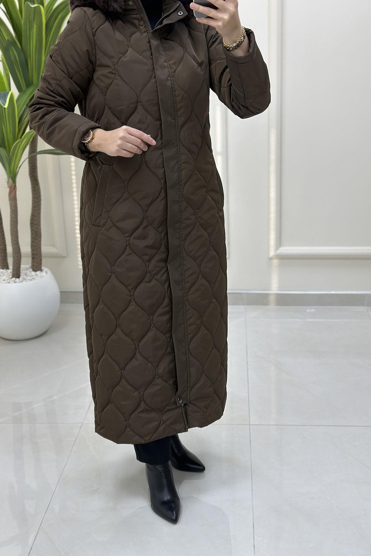 Belli Önü Fermuarlı Kapüşonu Kürklü Kadın Kapitone Kaban Kahverengi BELLİ 7001 (BELLİ-26K7001)