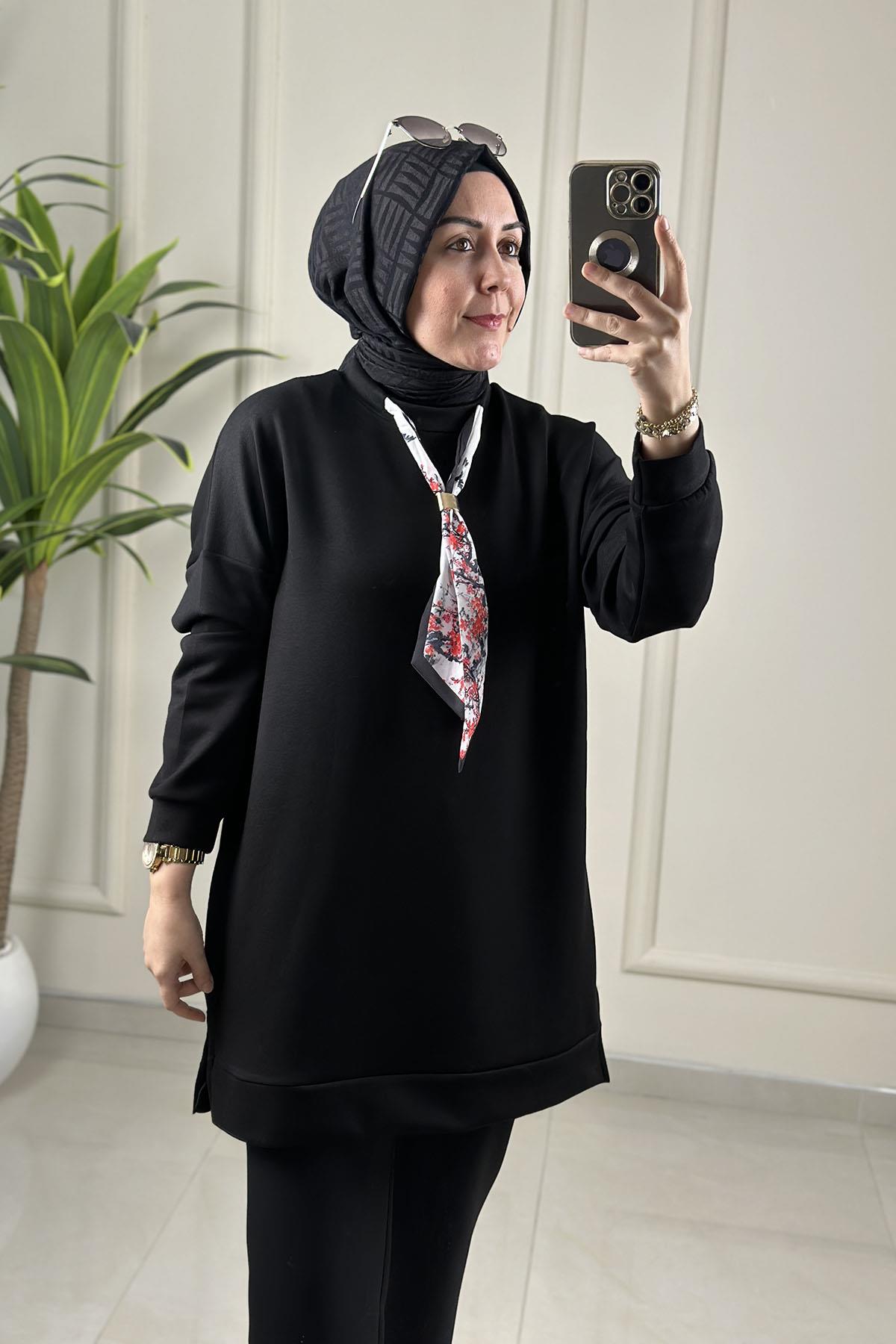 Düşük Omuz Fular Detaylı Kadın Tunik Siyah GNR 235 (GNR-26Y235)