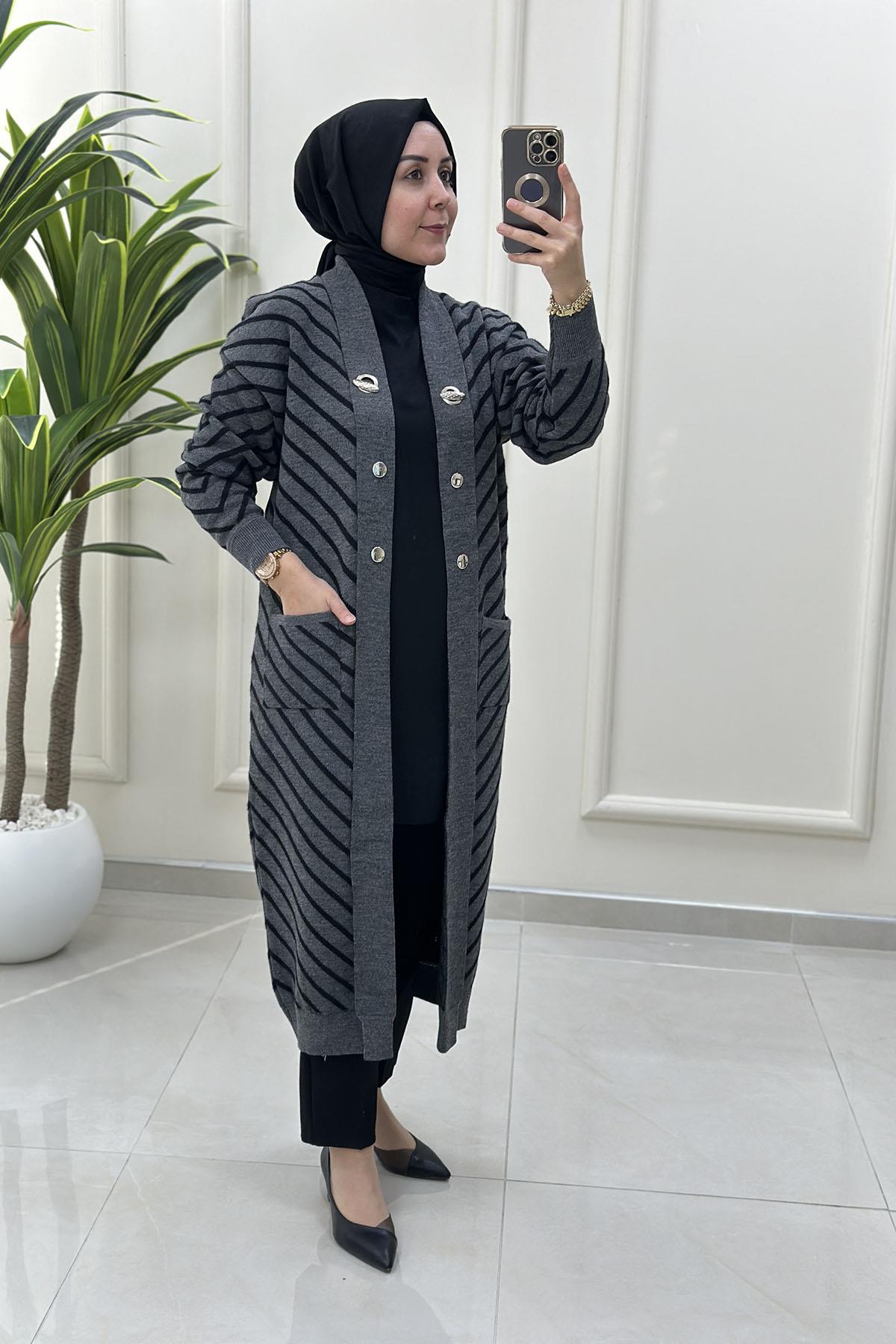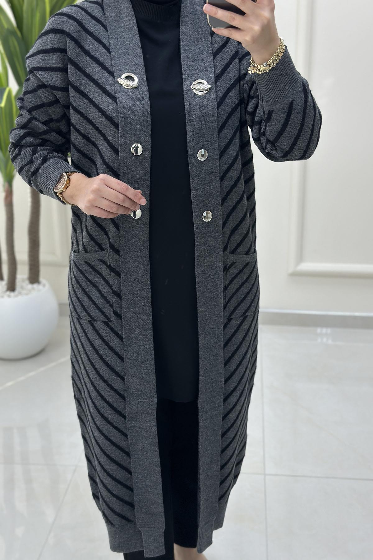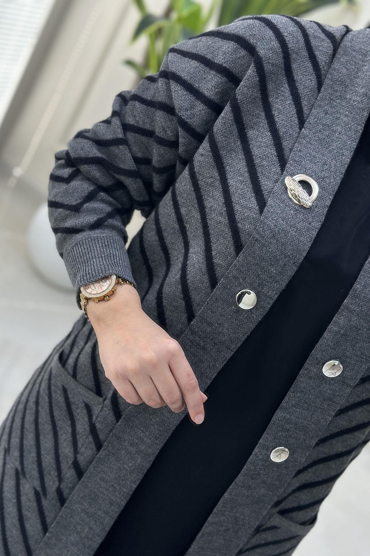 Düşük Omuz Kendinden Desenli Cepli Kadın Hırka Gri KADO 3381 (KADO-26K3381)