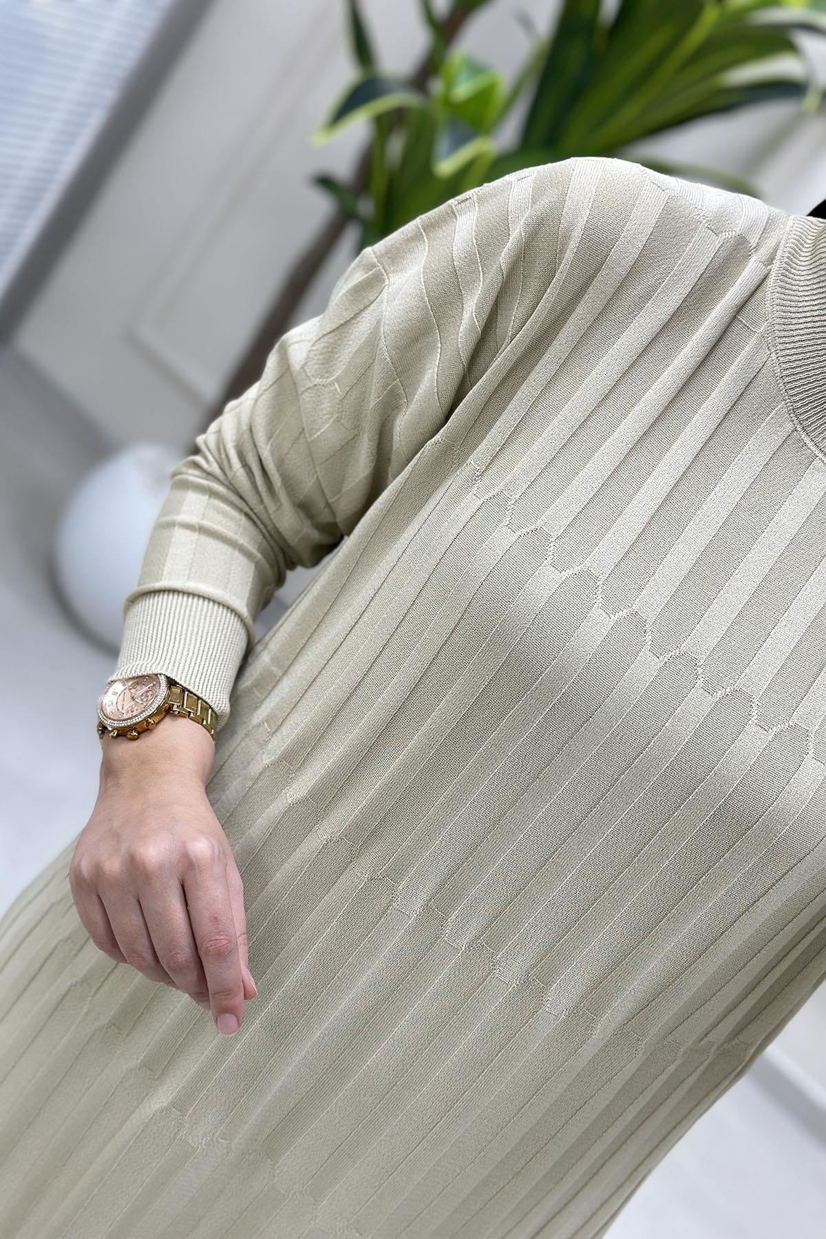 Düşük Omuz Kendinden Desenli Kadın Triko Elbise Bej KADO 2725538 (KADO-26K2725538)
