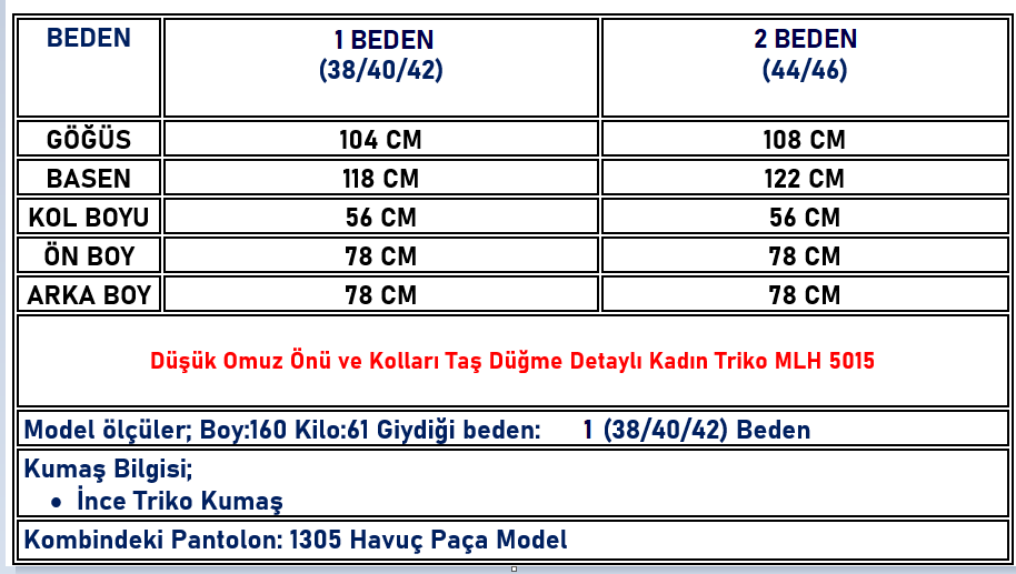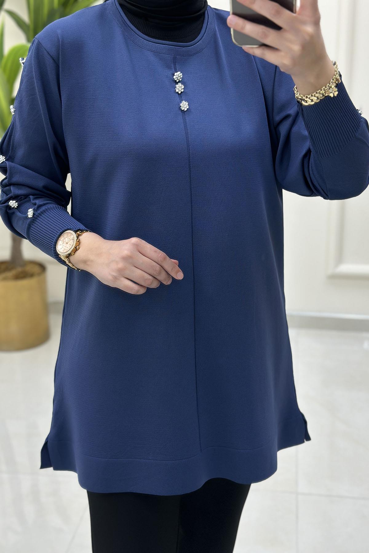 Düşük Omuz Önü ve Kolları Taş Düğme Detaylı Kadın Triko Tunik İndigo MLH 5015 (MLH-26K5015)