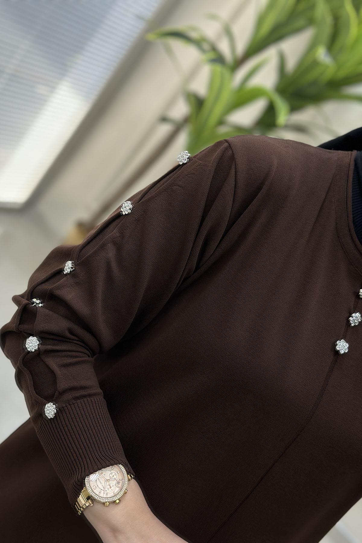 Düşük Omuz Önü ve Kolları Taş Düğme Detaylı Kadın Triko Tunik Kahverengi MLH 5015 (MLH-26K5015)