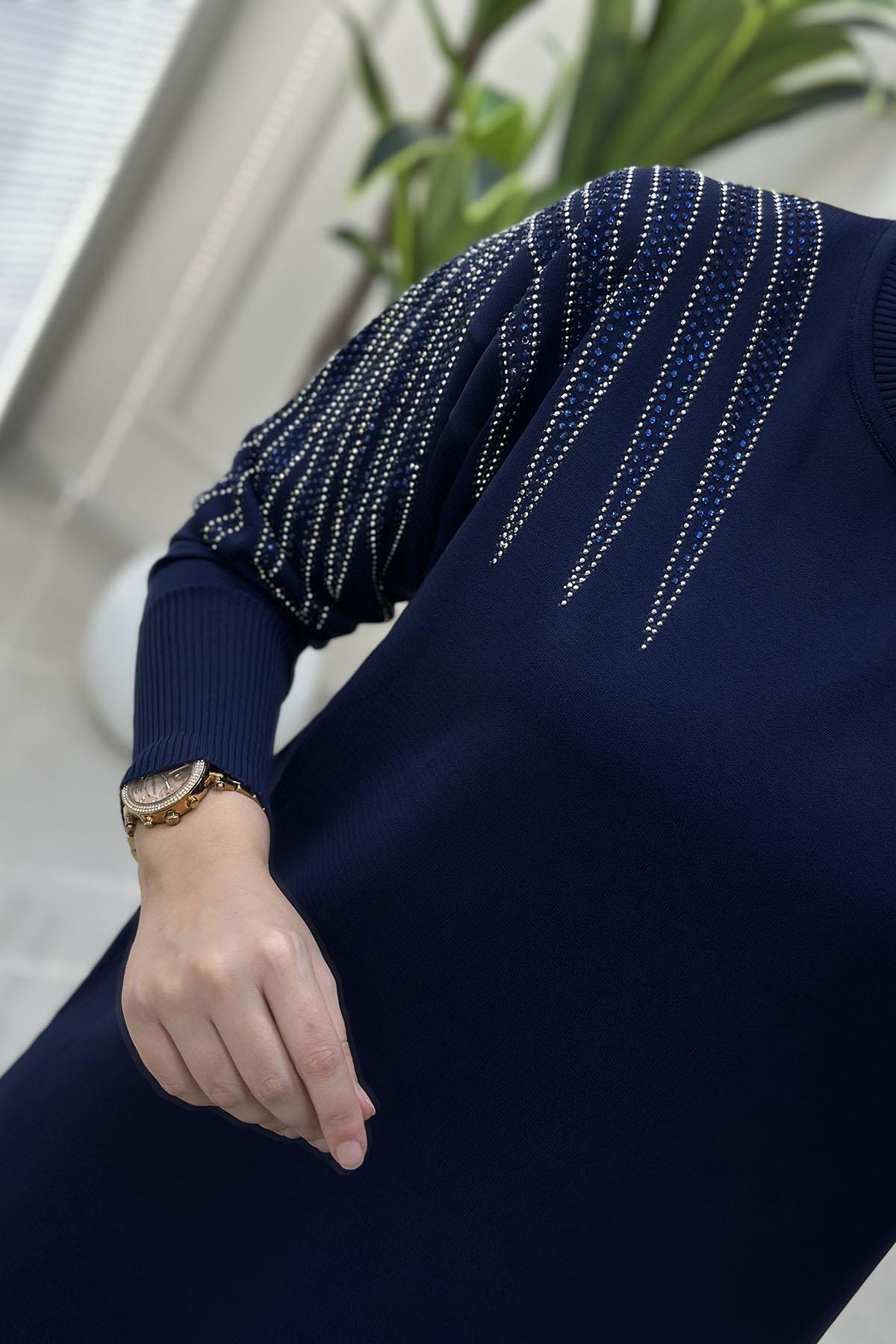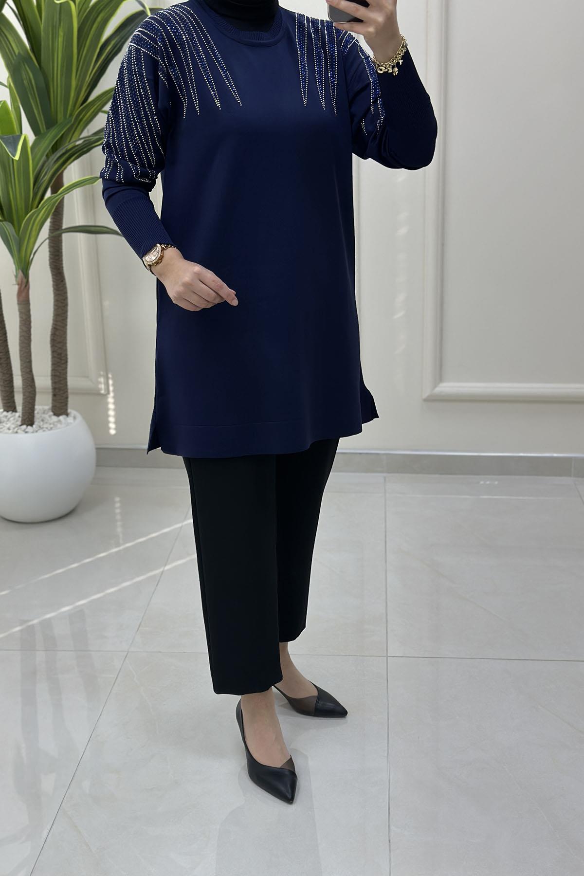 Düşük Omuz Taş Detaylı Merserize Kadın Tunik Lacivert MLH 5034 (MLH-26K5034)