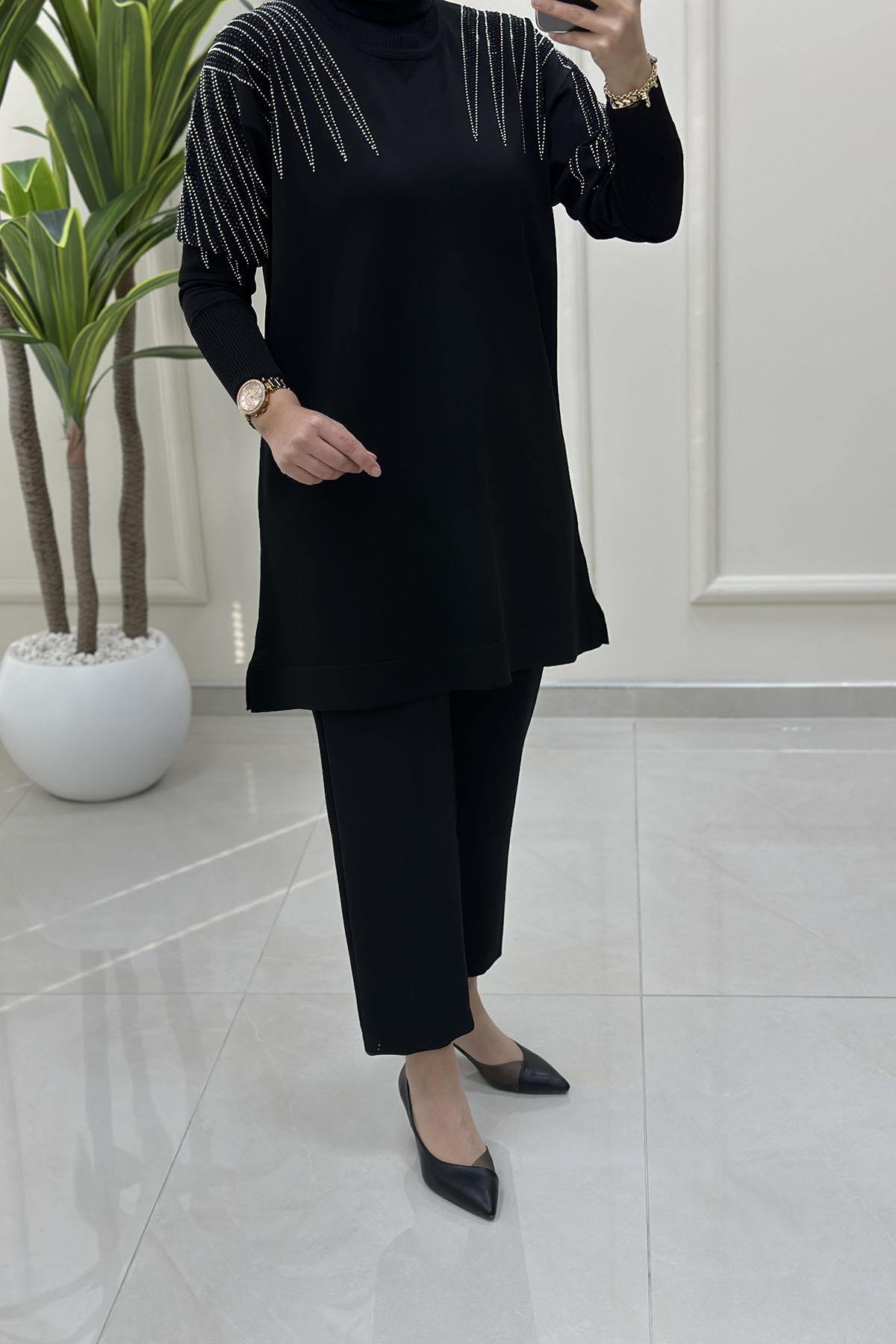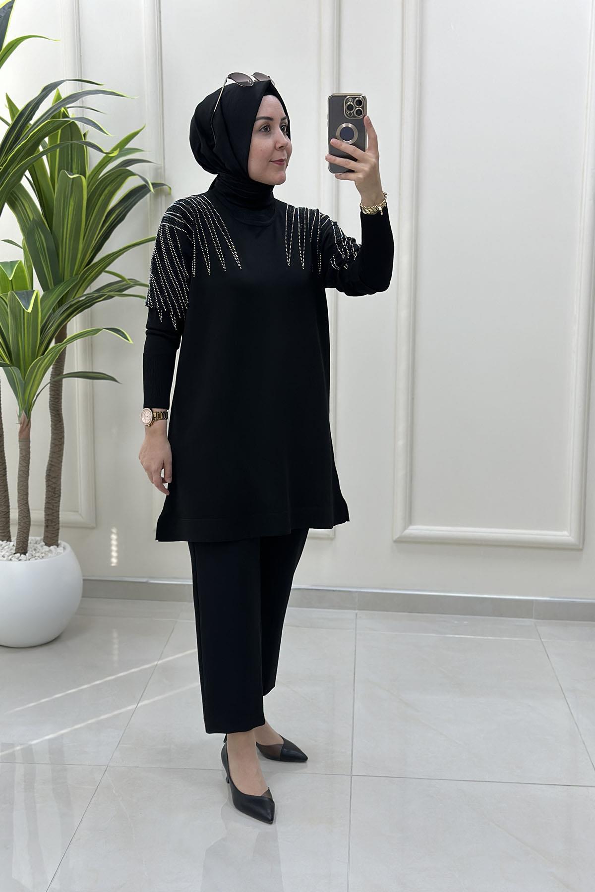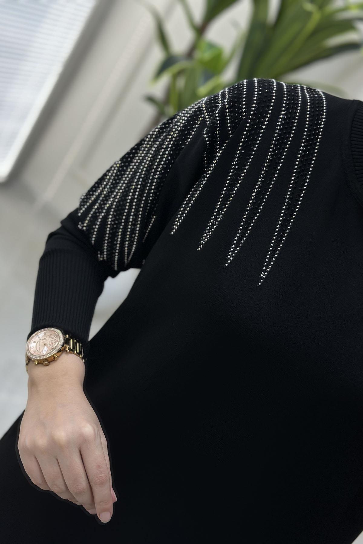 Düşük Omuz Taş Detaylı Merserize Kadın Tunik Siyah MLH 5034 (MLH-26K5034)
