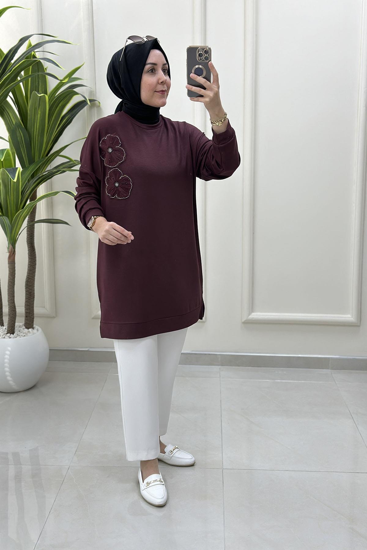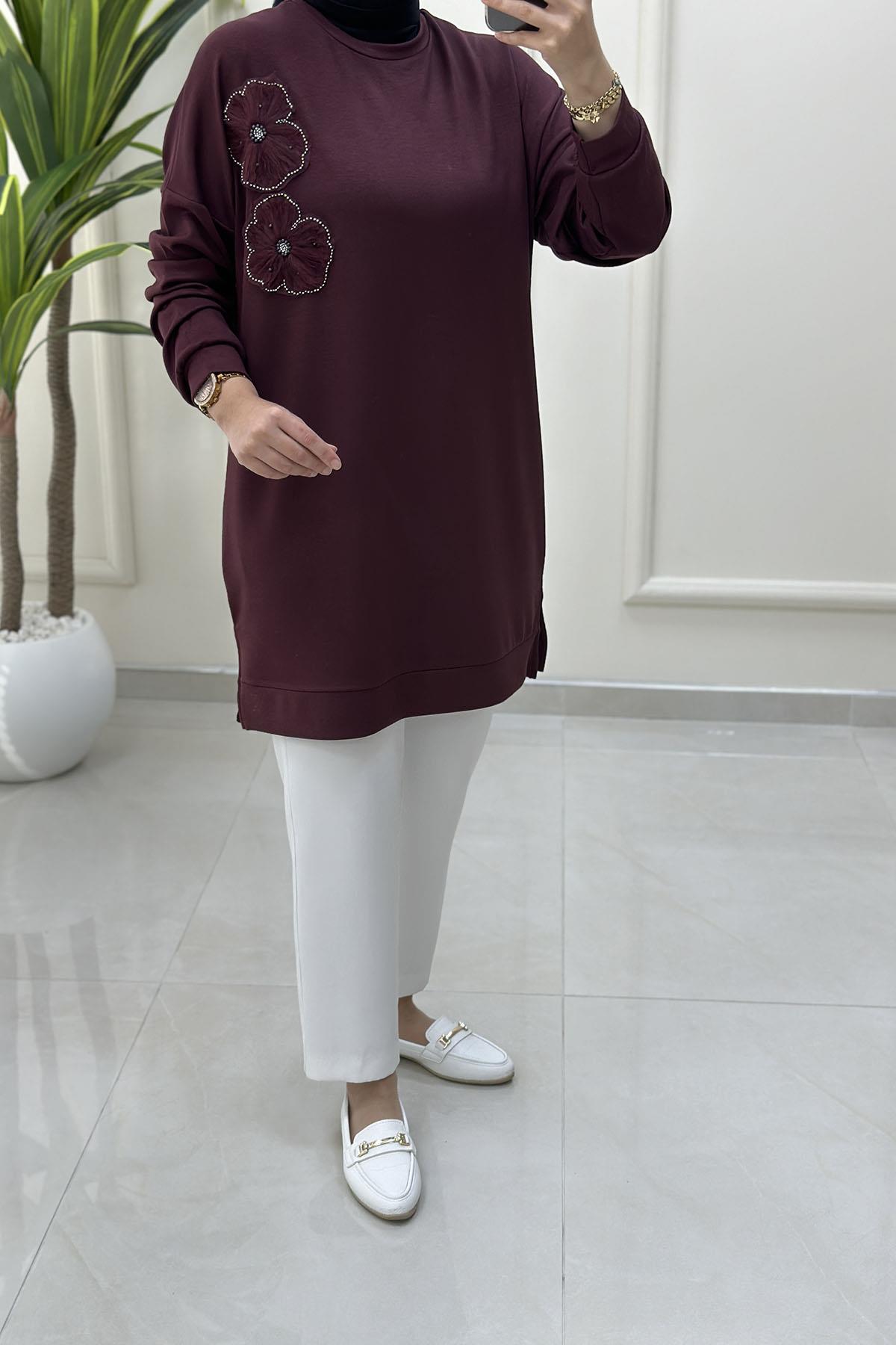 Düşük Omuz Tül Çiçek Motif Detaylı Kadın Tunik Açık Bordo GNR 216 (GNR-26K216)