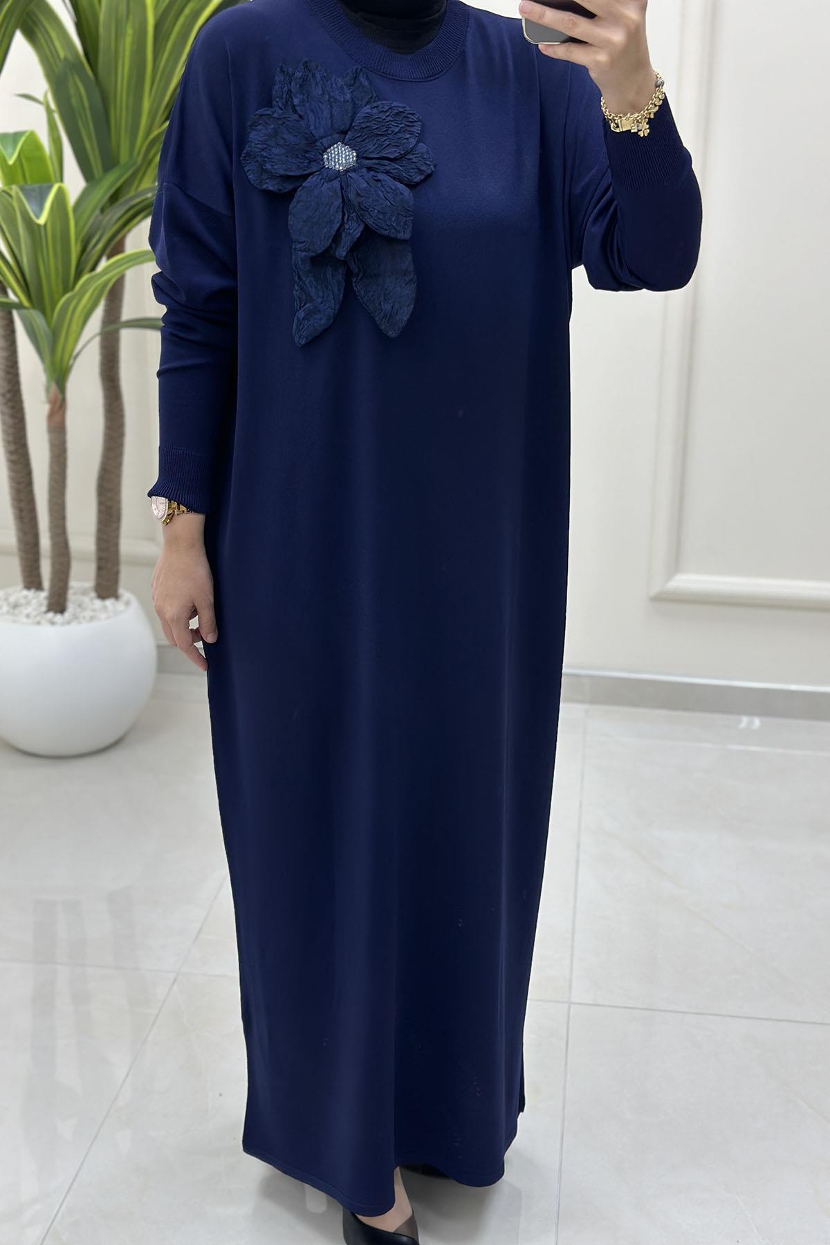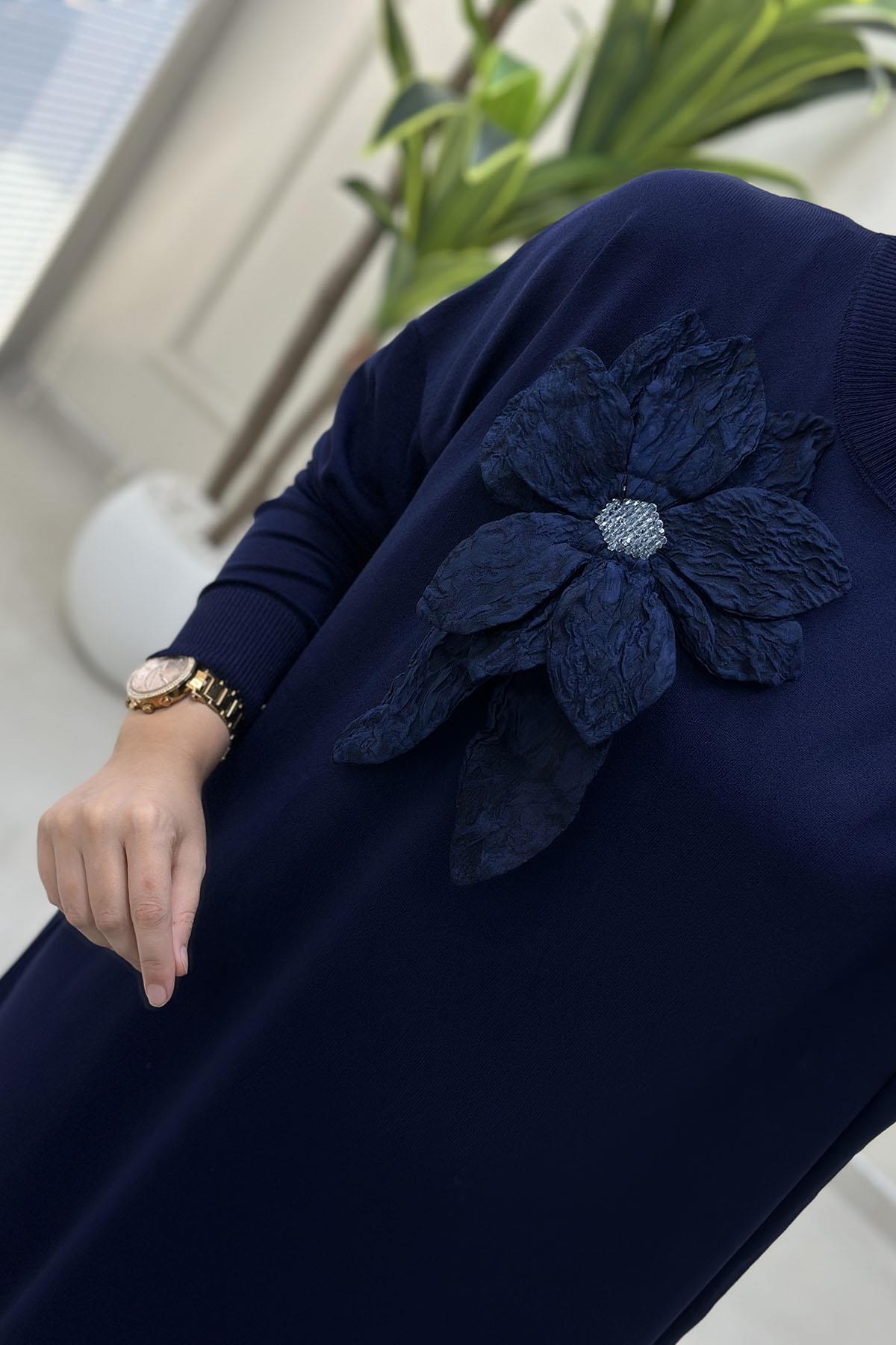 Düşük Omuz Yaka Çiçek Aksesuar Detaylı Kadın Triko Elbise Lacivert KADO 2725508 (KADO-26K2725508)