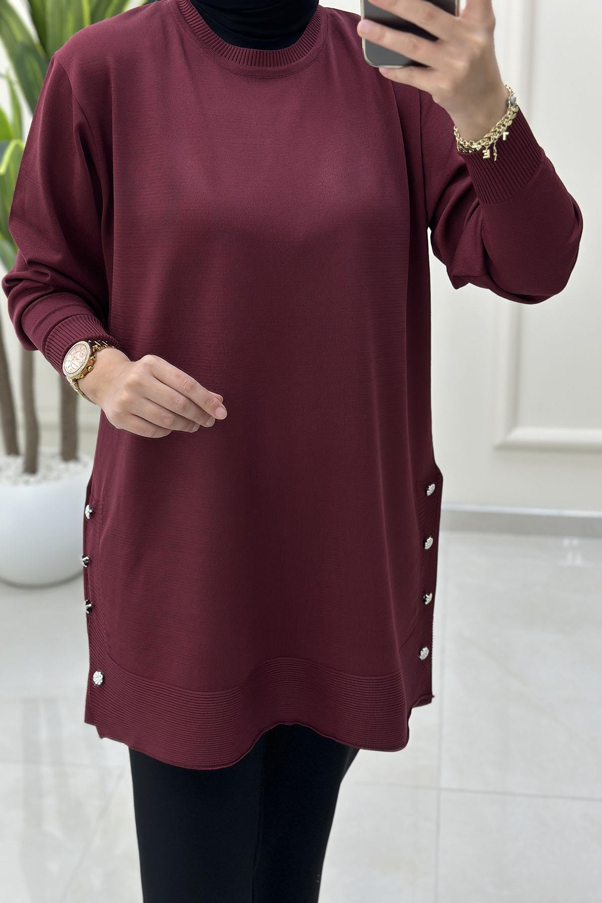 Düşük Omuz Yanları Aksesuar Detaylı Triko Kadın Tunik Bordo MLH 5013 (MLH-26K5013)