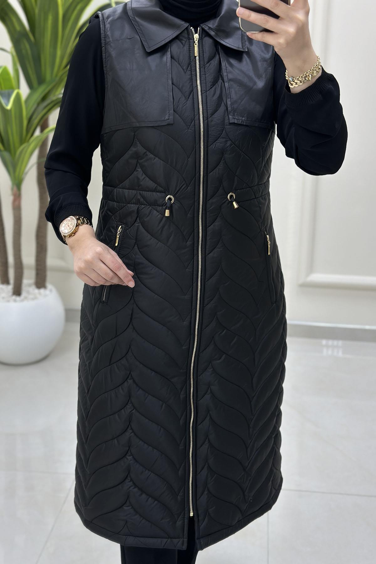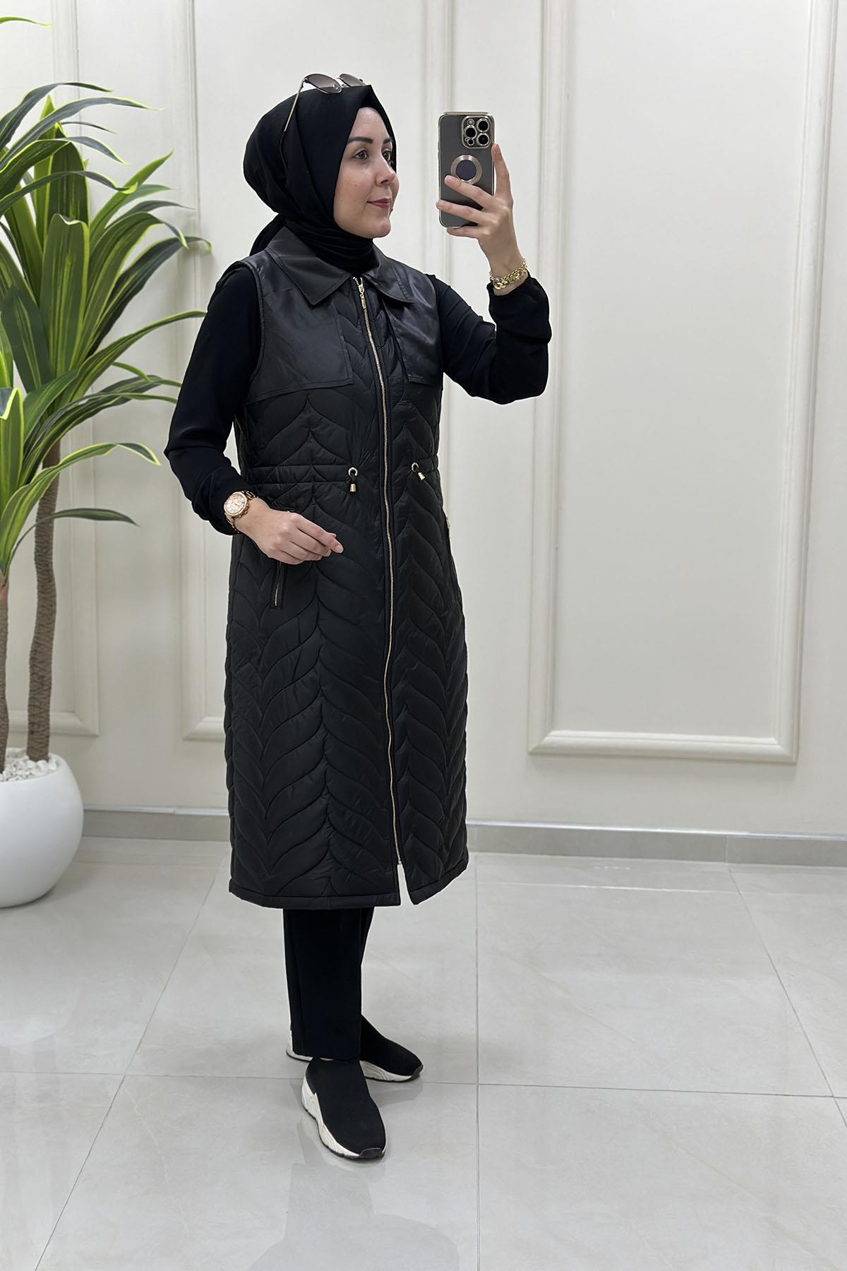 Kapitone Dolum Önü Fermuarlı Beli Büzgülü Kadın Yelek Siyah QTN 4965 (QTN-26K4965)