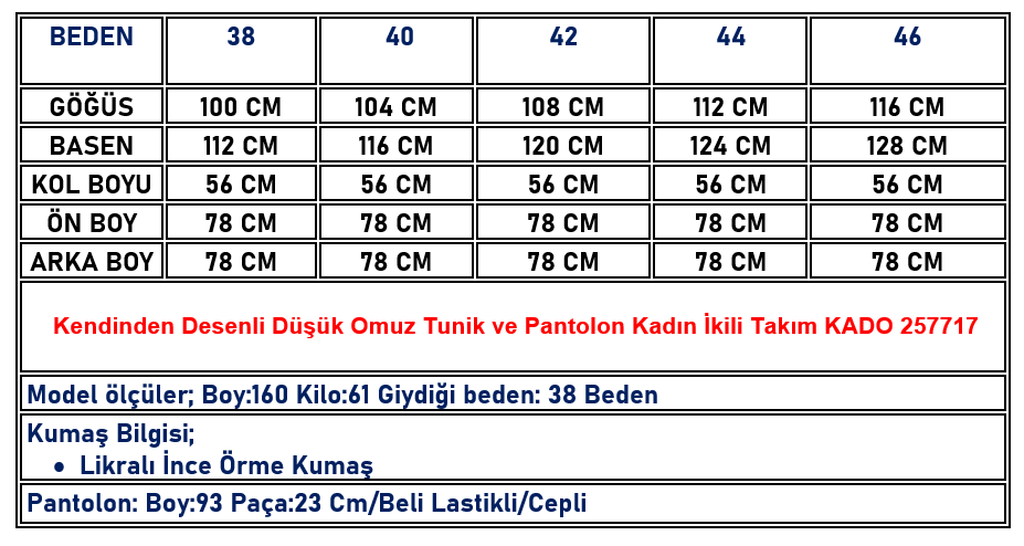 Kendinden Desenli Düşük Omuz Tunik ve Pantolon Kadın İkili Takım Bej KADO 257717 (KADO-26K257717)