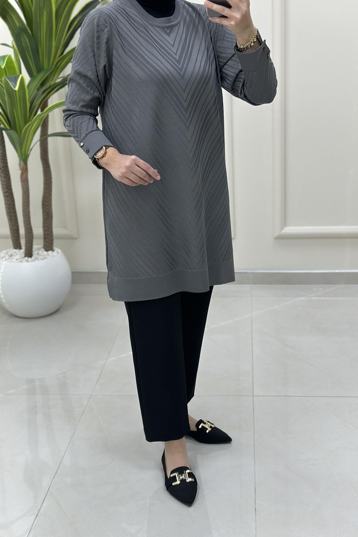 Kendinden Desenli Kol Düğme Detaylı Kadın Triko Tunik Gri KADO 2725027 (KADO-26K2725027)