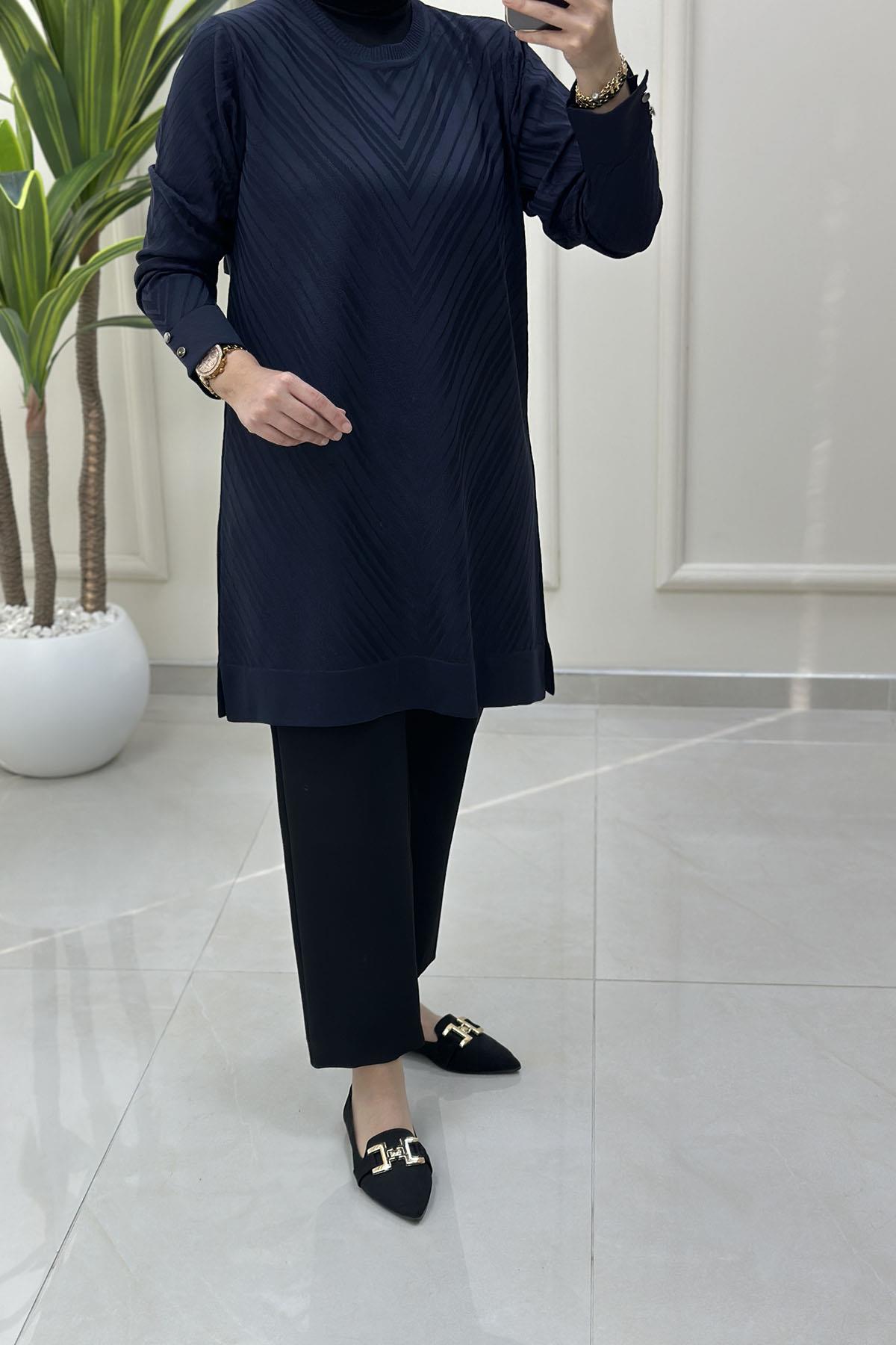 Kendinden Desenli Kol Düğme Detaylı Kadın Triko Tunik Lacivert KADO 2725027 (KADO-26K2725027)