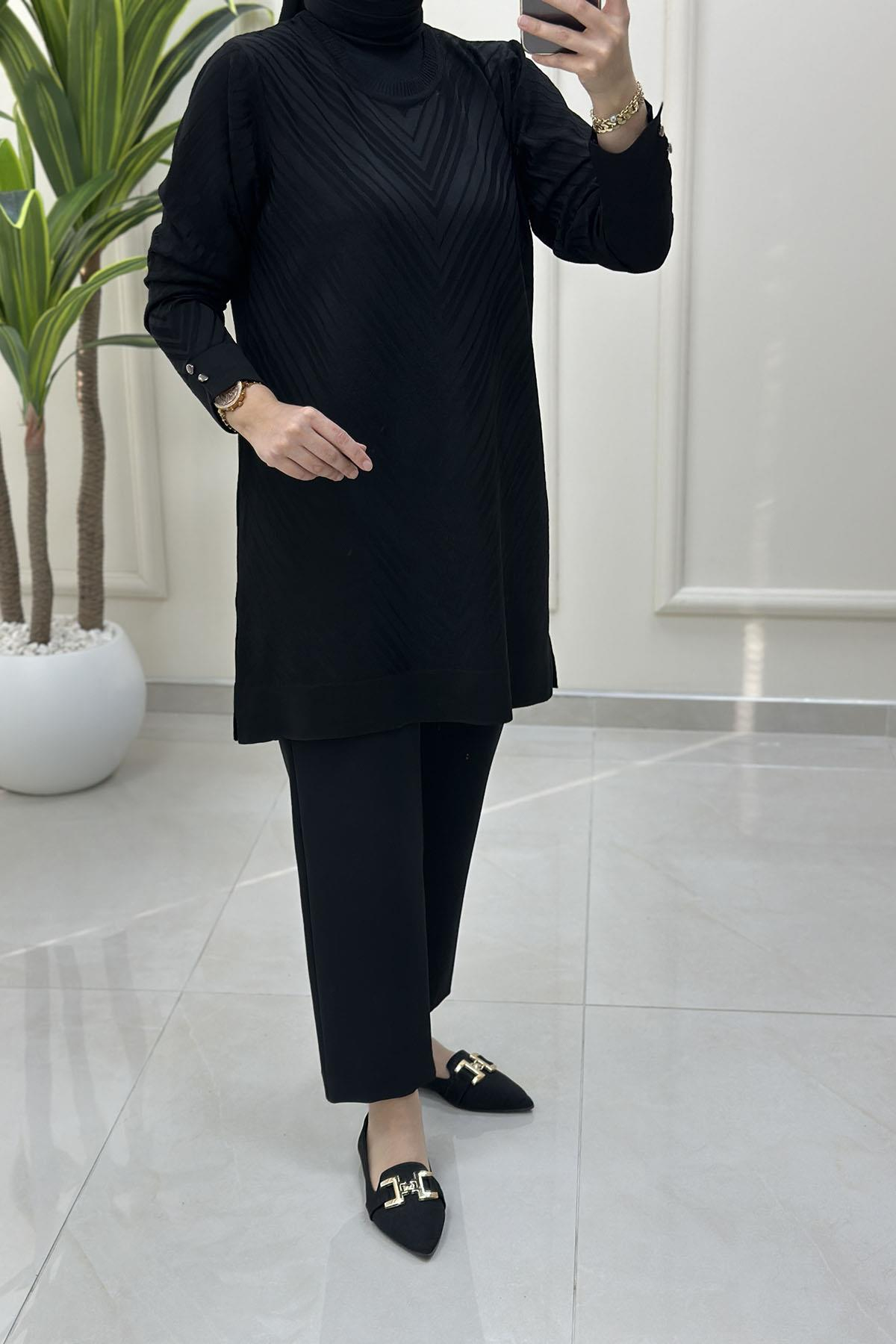 Kendinden Desenli Kol Düğme Detaylı Kadın Triko Tunik Siyah KADO 2725027 (KADO-26K2725027)