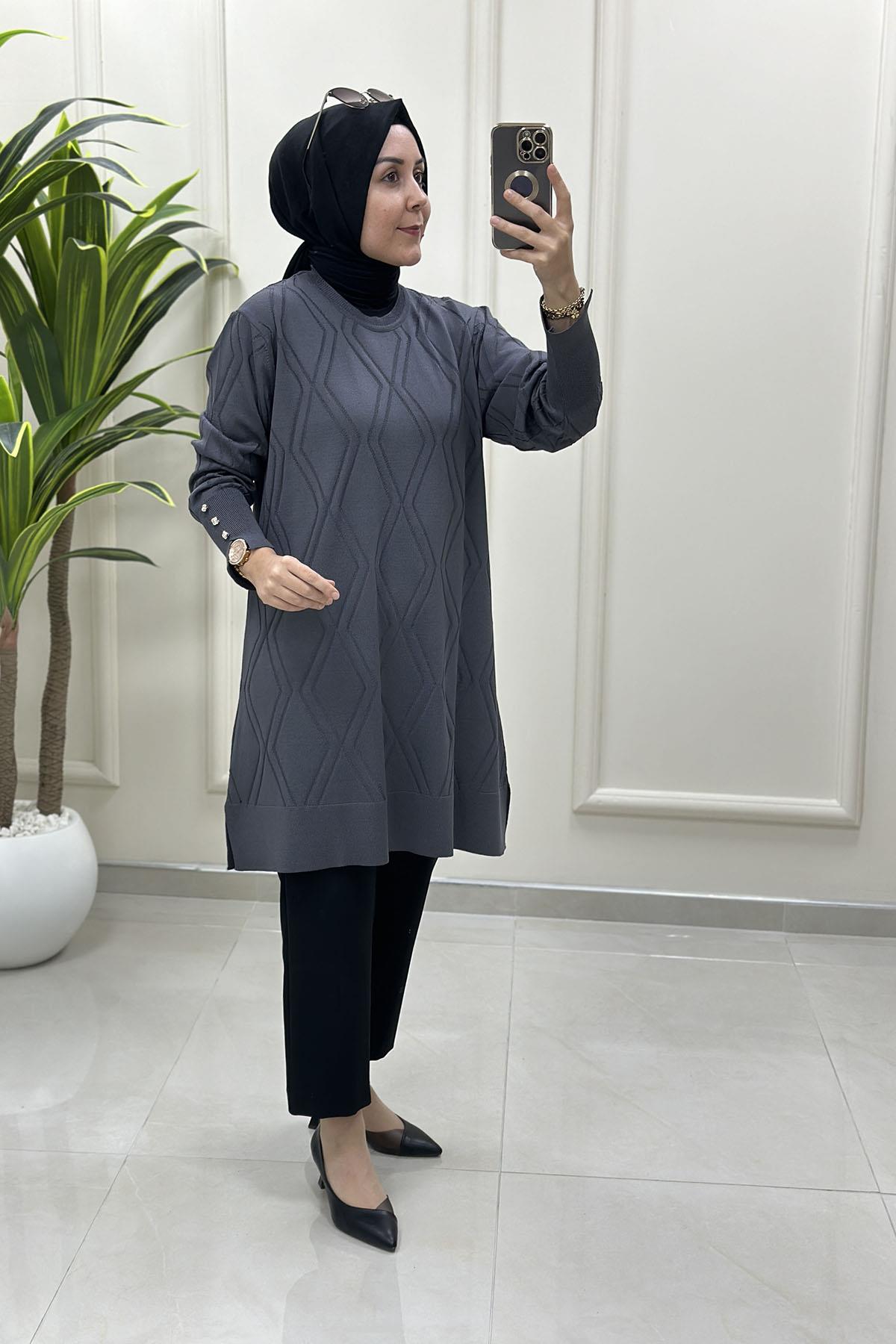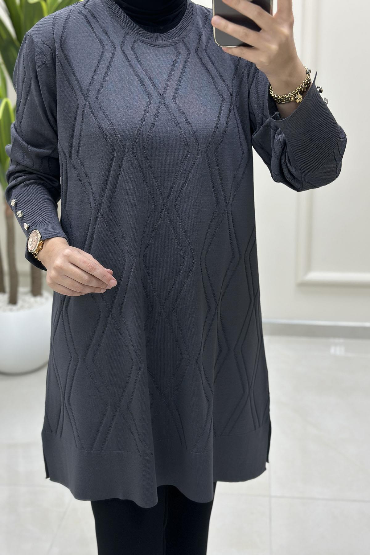 Kendinden Desenli Kolu Düğme Detaylı Kadın Triko Tunik Gri KADO 2725303 (KADO-26K2725303)