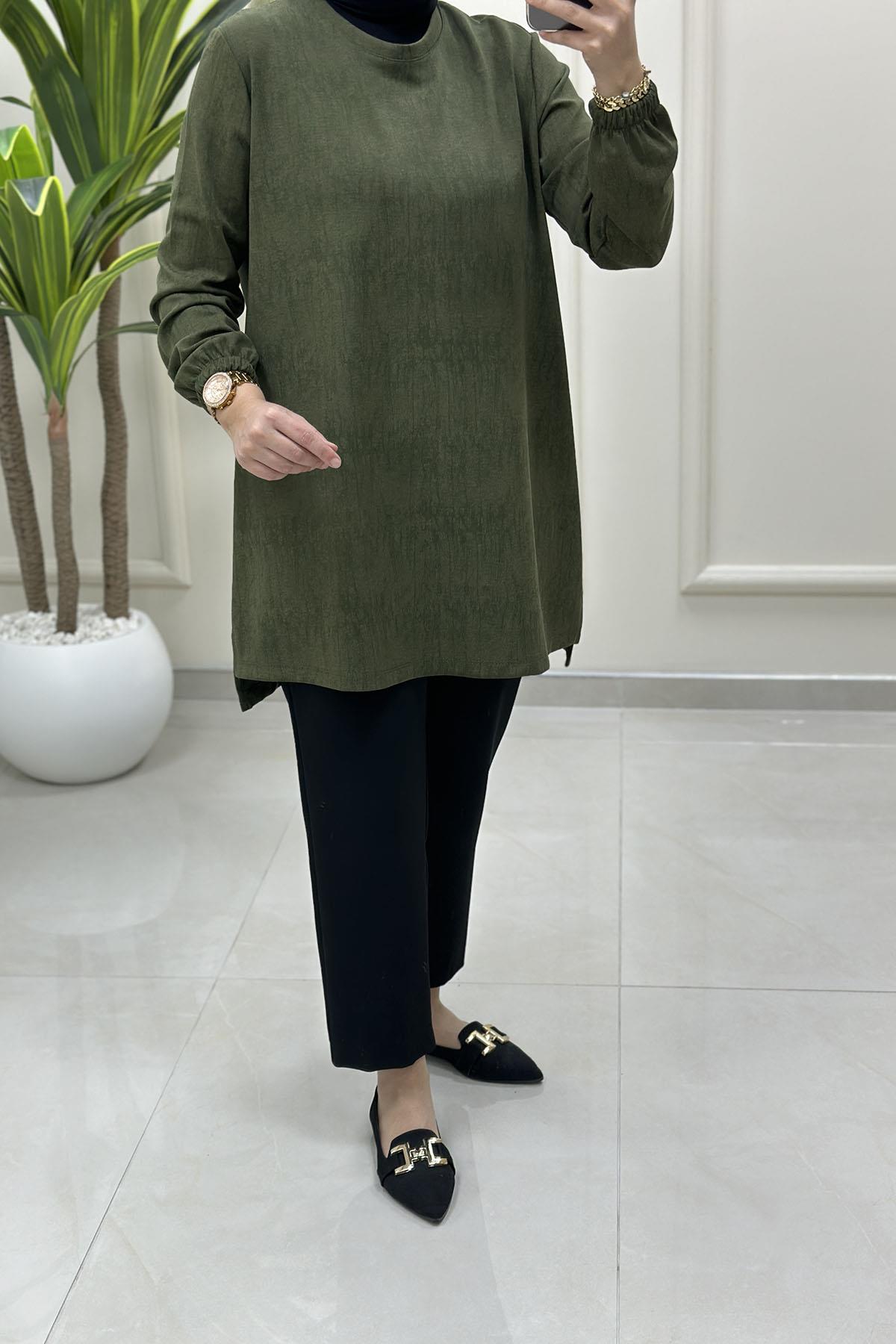 Kendinden Desenli Kolu Lastikli Modal Kadın Tunik Haki KADO 257393 (KADO-26K257393)
