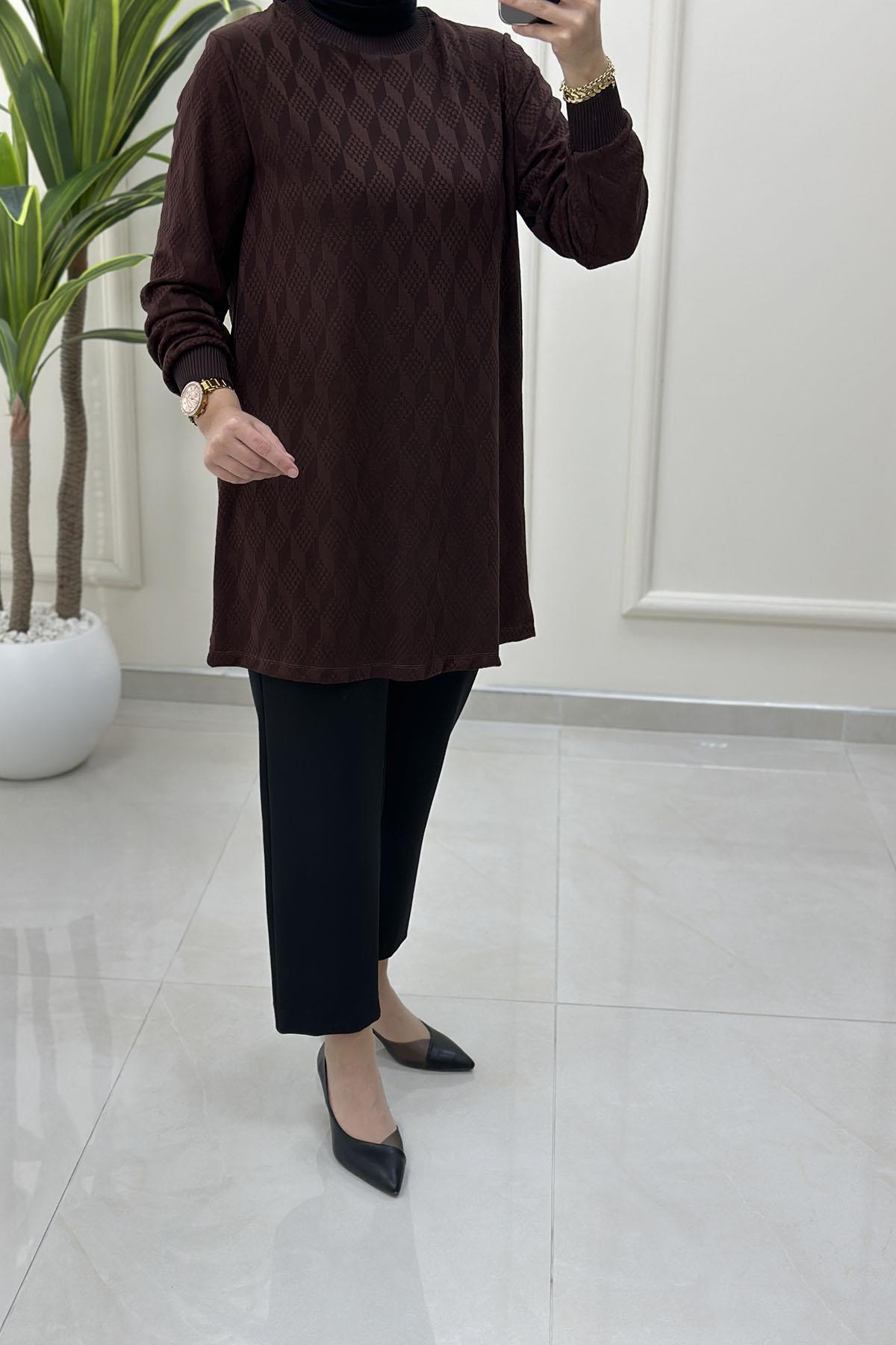 Kendinden Desenli Ribana Detaylı Kadın Tunik Kahverengi KADO 257480 (KADO-26K257480)