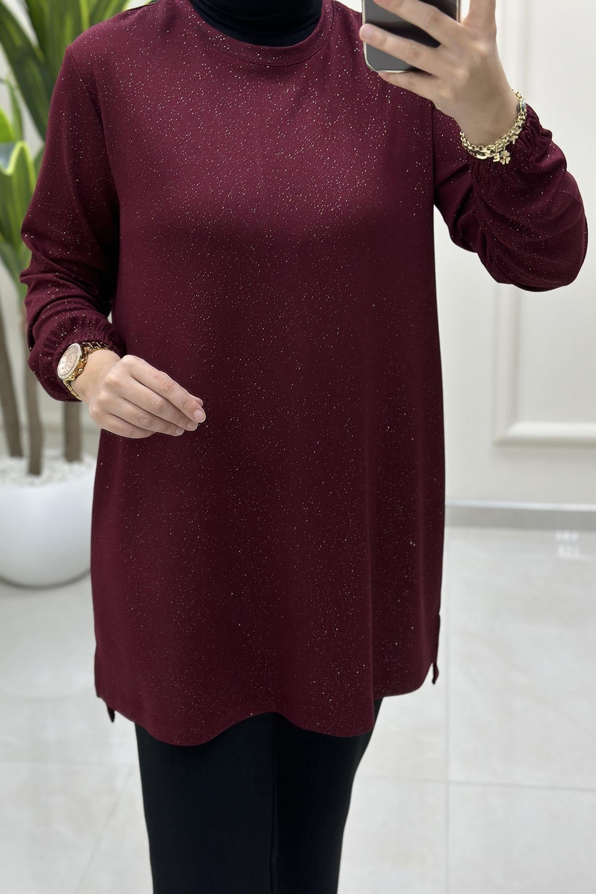 Kendinden Simli Kolu Lastikli Kadın Tunik Bordo KADO 257886