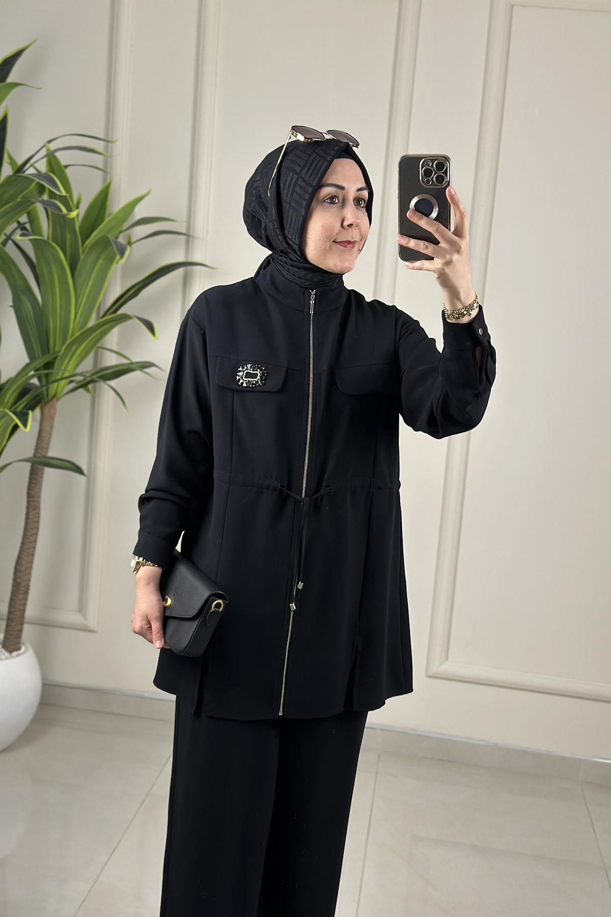 Krep Önü Fermuarlı Aksesuar Detaylı Ceket ve Pantolon Kadın İkili Takım Siyah ALS 5234 (ALS-26K5234)