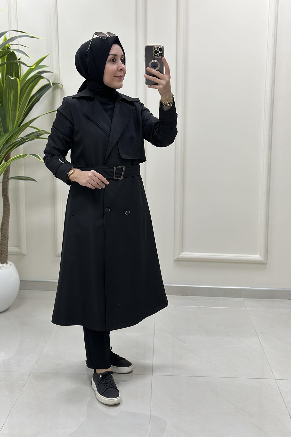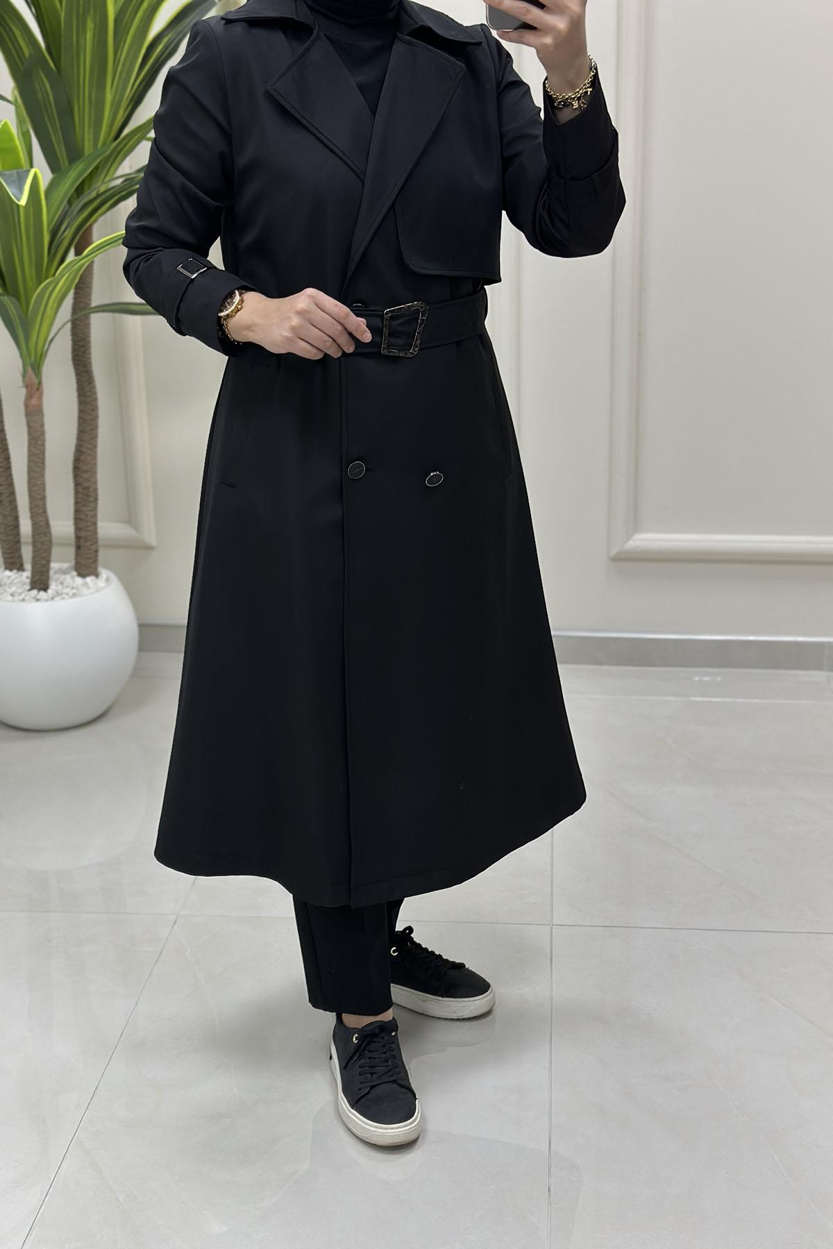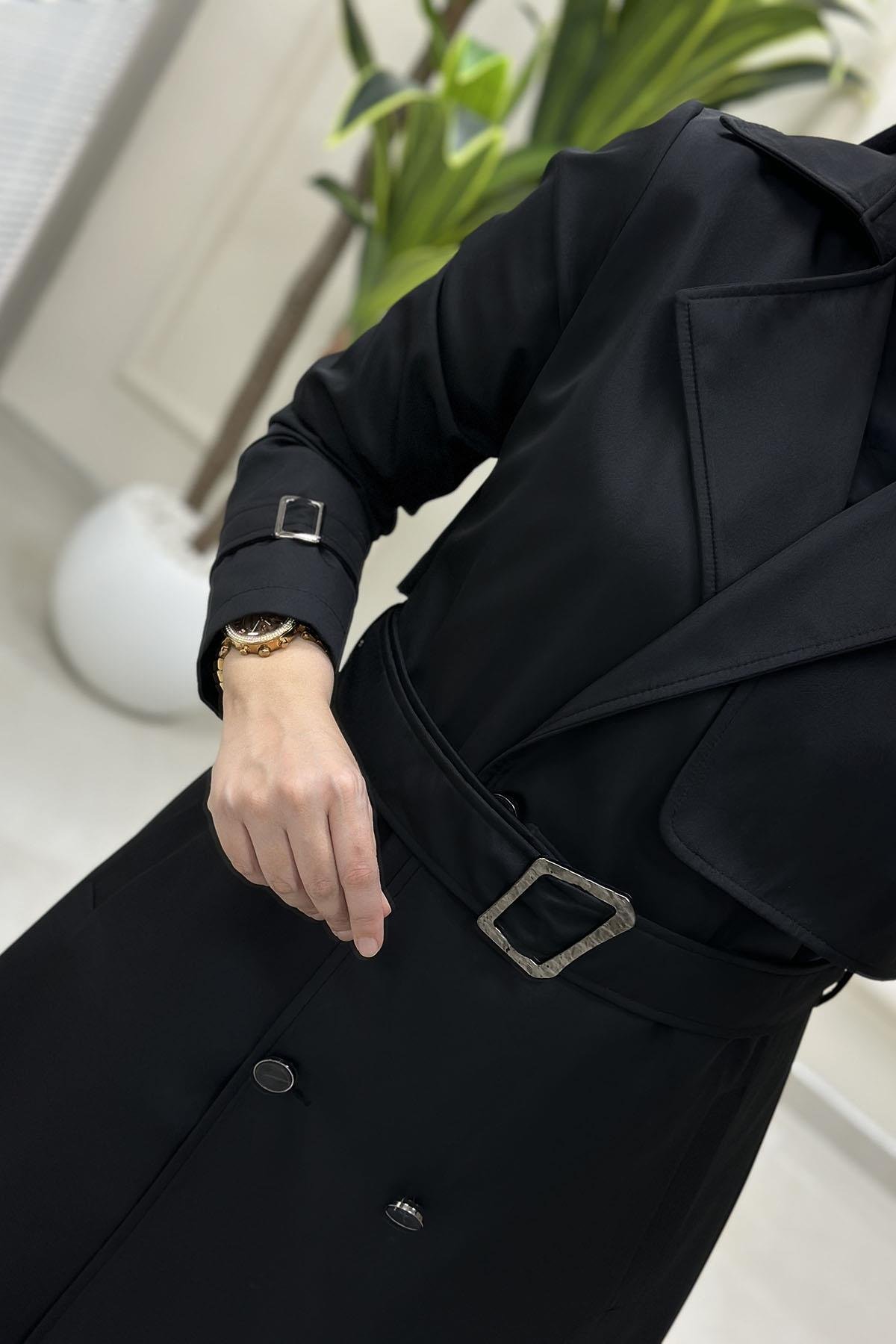 Kruvaze Yaka Düğmeli Beli Kemerli Kadın Trench Kap Siyah CNR 2280 (CNR-26K2280)