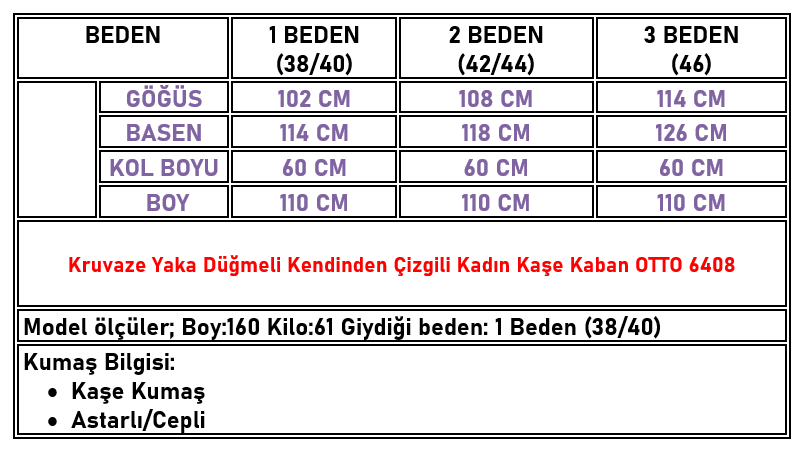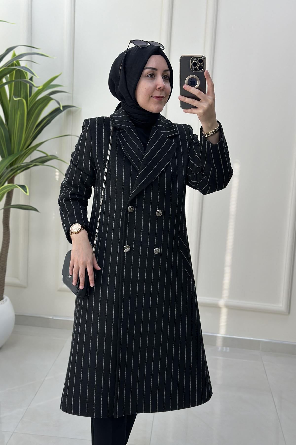 Kruvaze Yaka Düğmeli Kendinden Çizgili Kadın Kaşe Kaban Siyah OTTO 6408