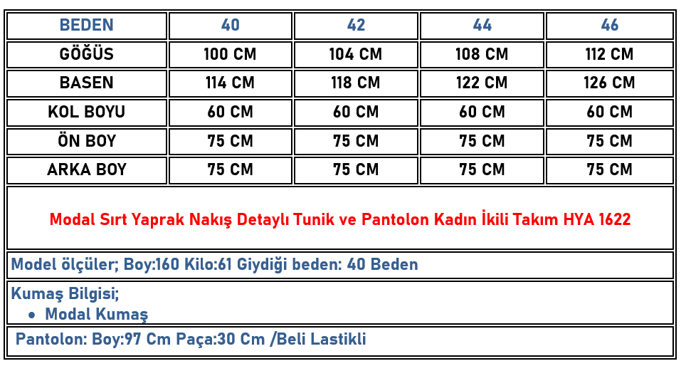 Modal Sırt Yaprak Nakış Detaylı Tunik ve Pantolon Kadın İkili Takım Lacivert HYA 1622 (HYA-26K1622)