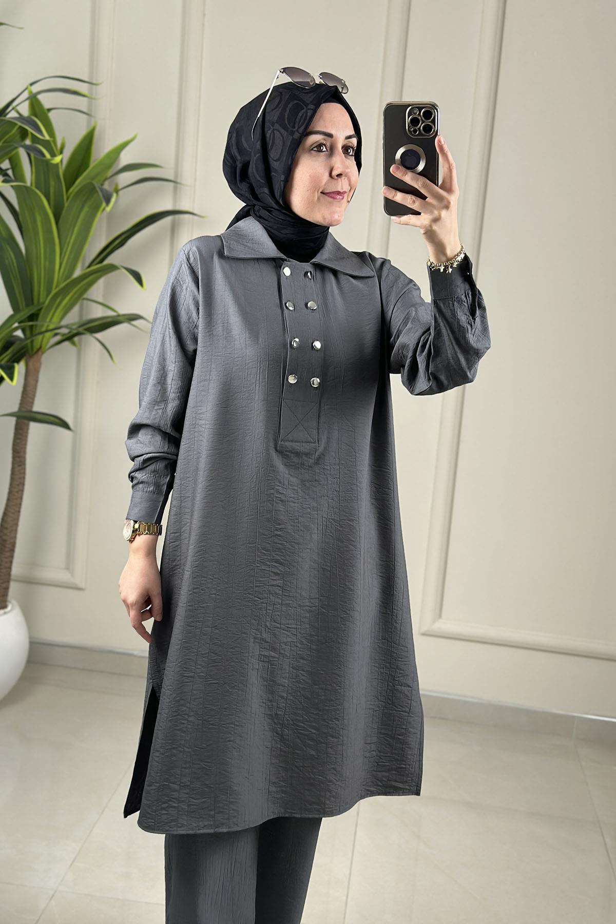 Önü Çift Düğme Detaylı Tunik ve Pantolon Kadın İkili Takım Gri KADO 262366
