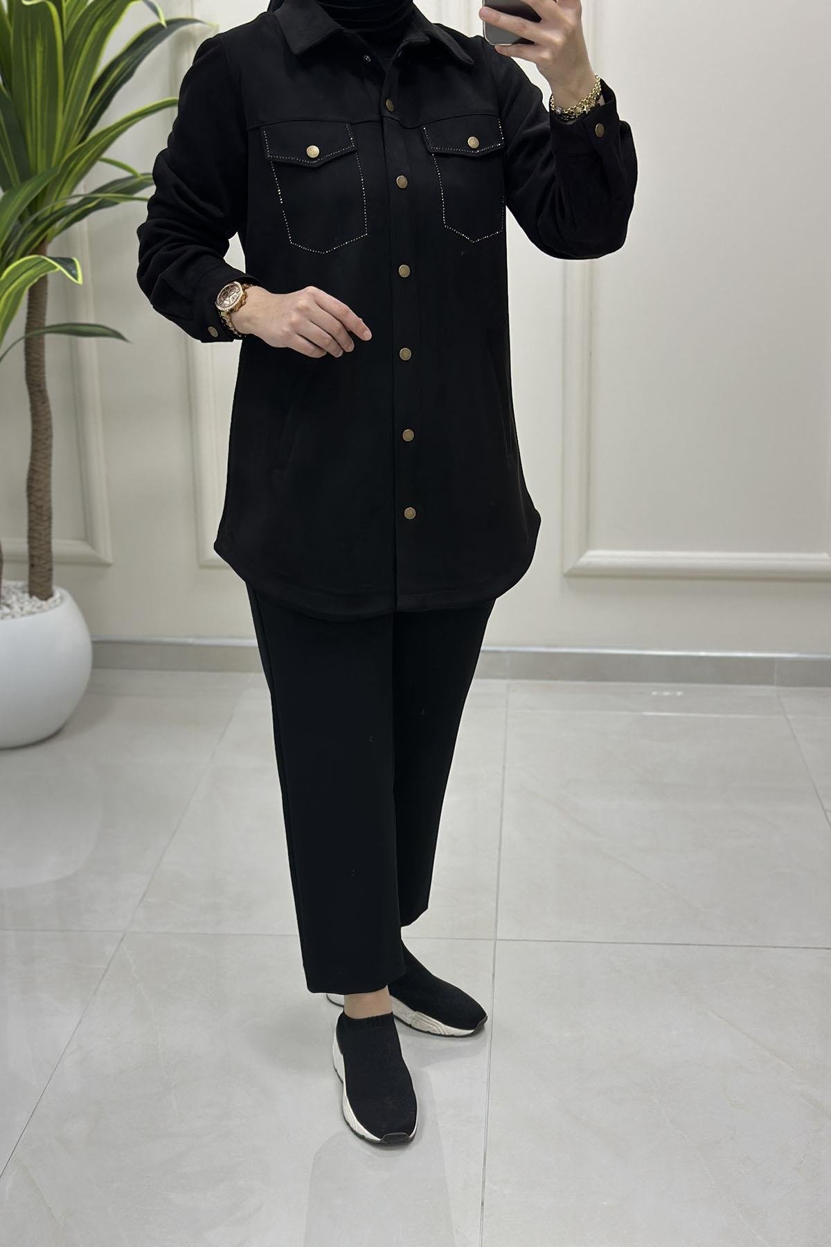 Önü Çıtçıtlı Kapak Cep Taş Detaylı Kadın Süet Ceket Siyah BRL 7213 (BRL-226K7213)