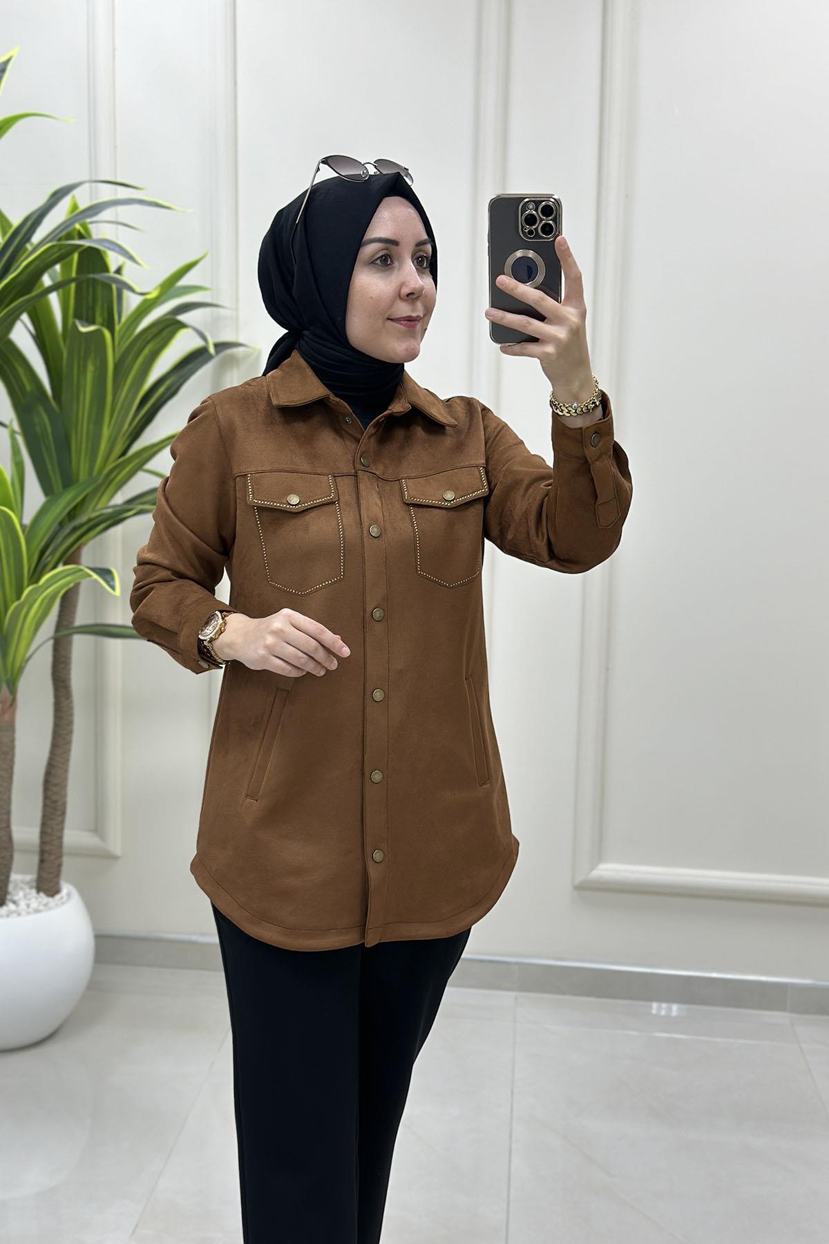 Önü Çıtçıtlı Kapak Cep Taş Detaylı Kadın Süet Ceket Taba BRL 7213 (BRL-226K7213)