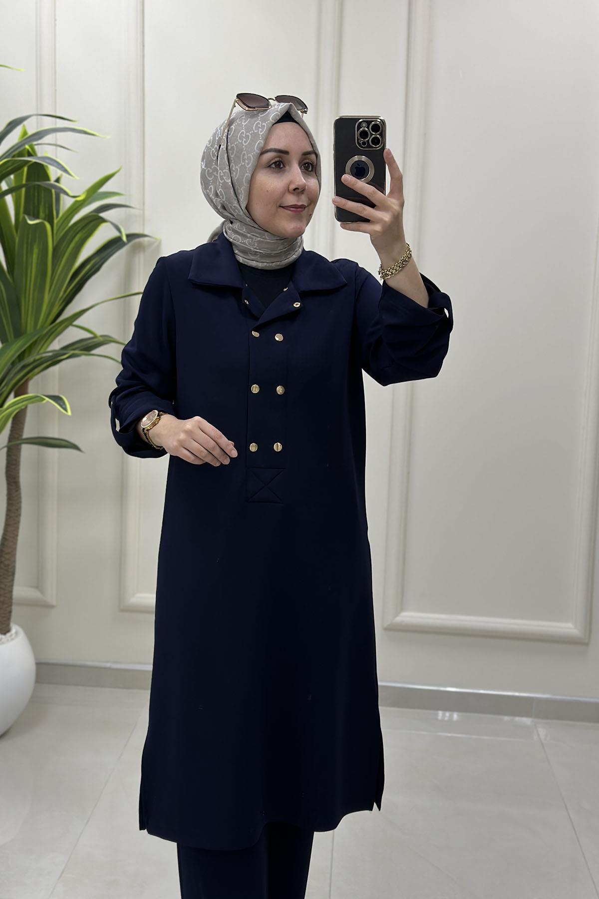 Önü Çıtçıtlı Katlama Kol Tunik ve Pantolon Kadın İkili Takım Lacivert VOL 1456 (VOL-26K1456)