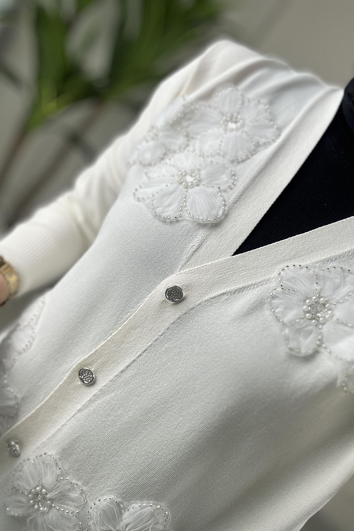 Önü Düğmeli Çiçek Motifli Merserize Kadın Hırka Ekru SFF 145111 (SFF-26K145111)