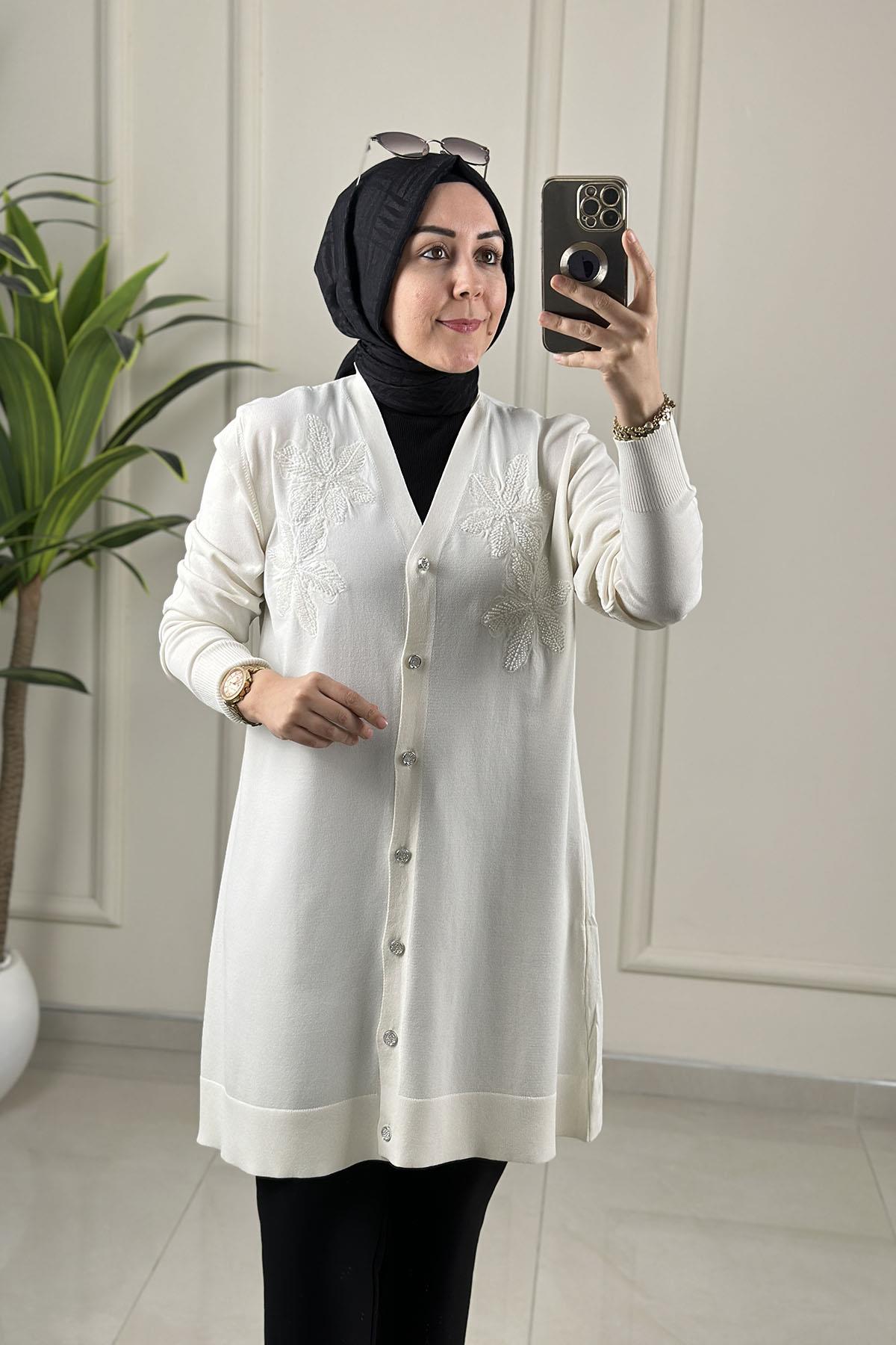Önü Düğmeli Çiçek Nakışlı Merserize Kadın Hırka Ekru SFF 145110 (SFF-26K145110)