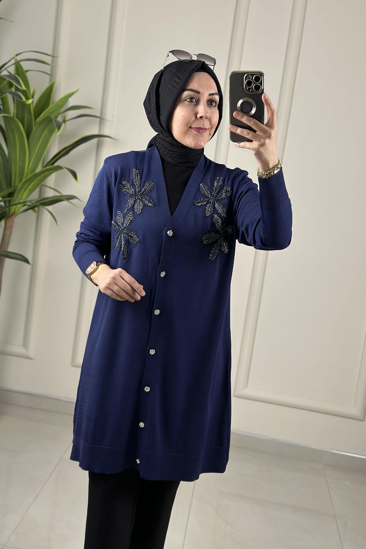 Önü Düğmeli Çiçek Nakışlı Merserize Kadın Hırka Lacivert SFF 145110 (SFF-26K145110)