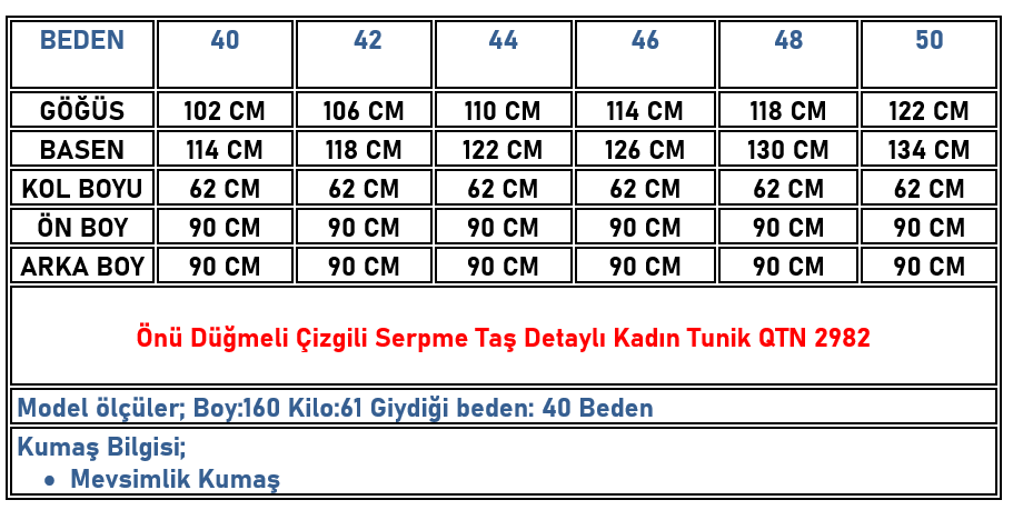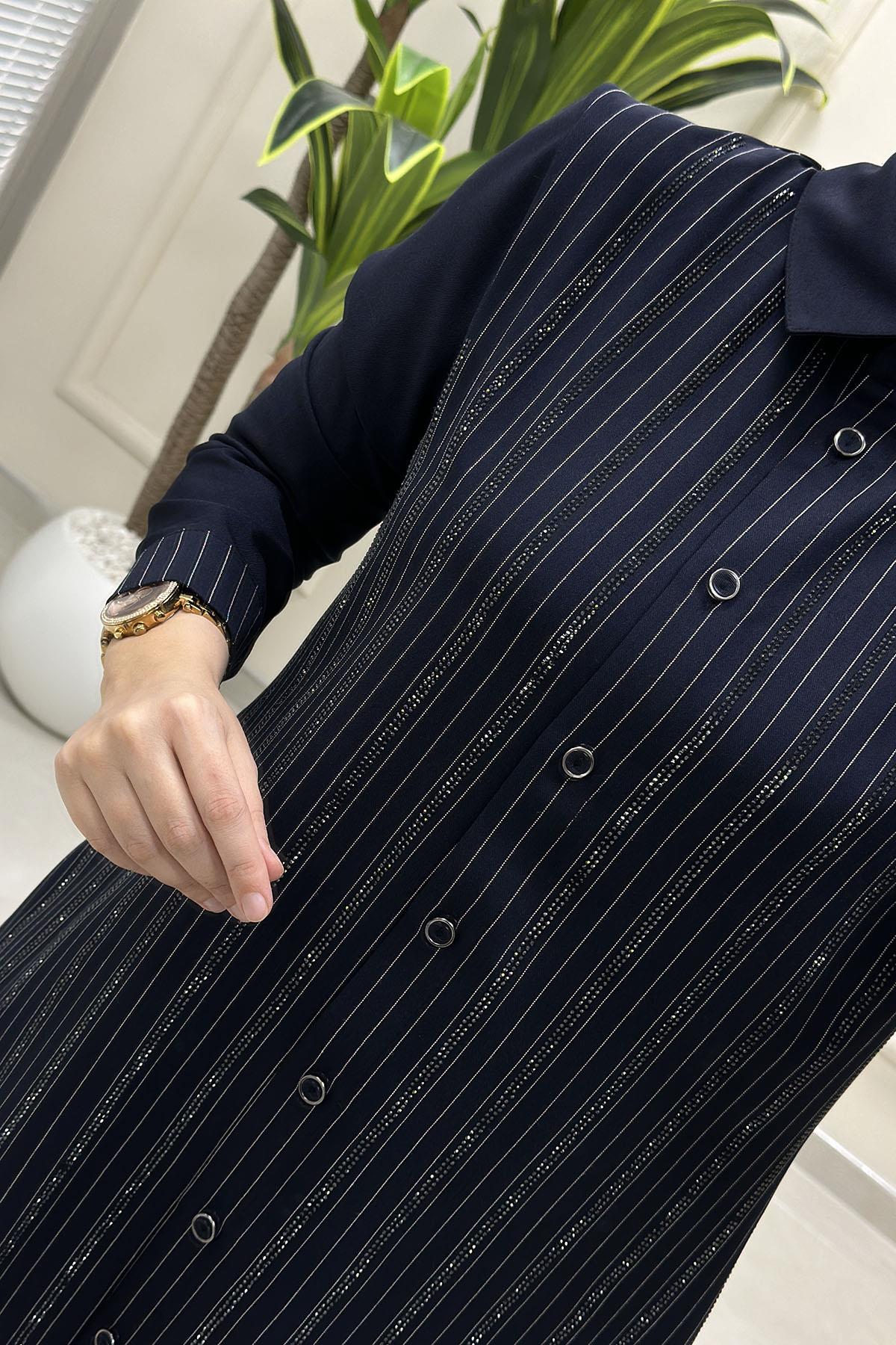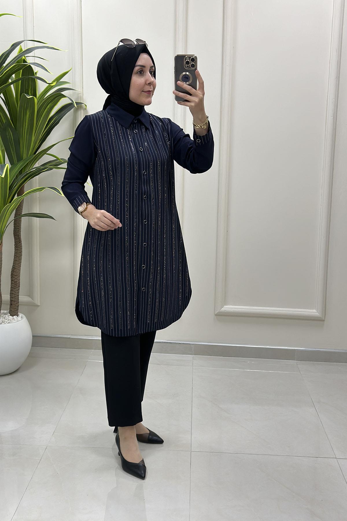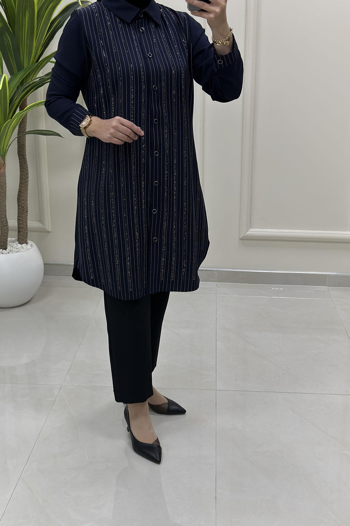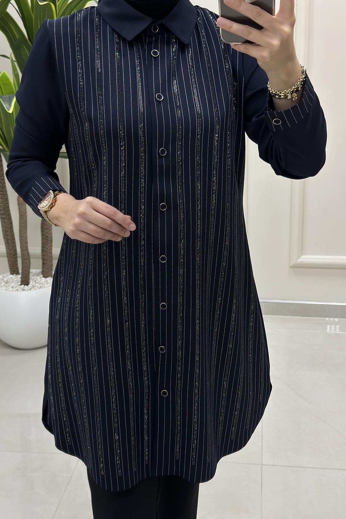 Önü Düğmeli Çizgili Serpme Taş Detaylı Kadın Tunik Lacivert QTN 2982 (QTN-26K2982)