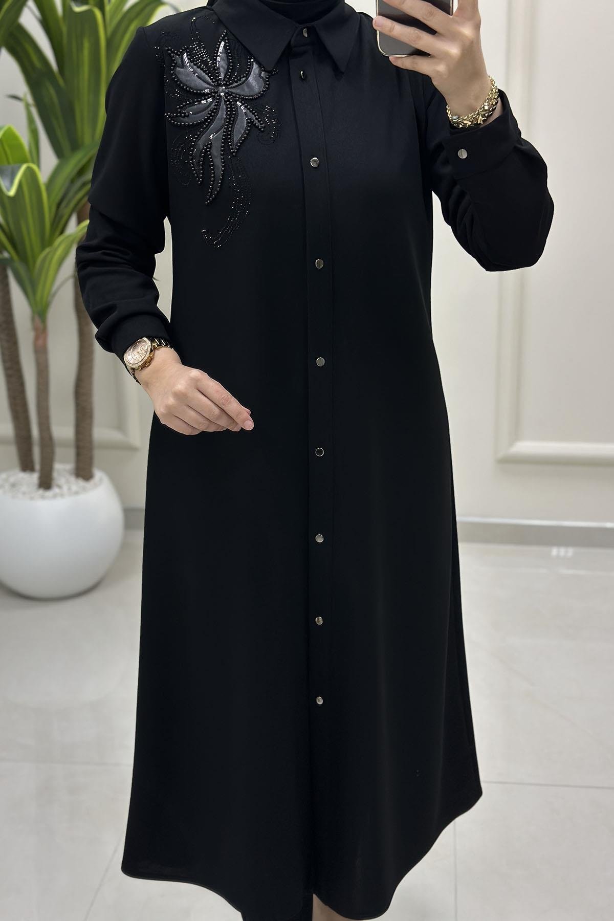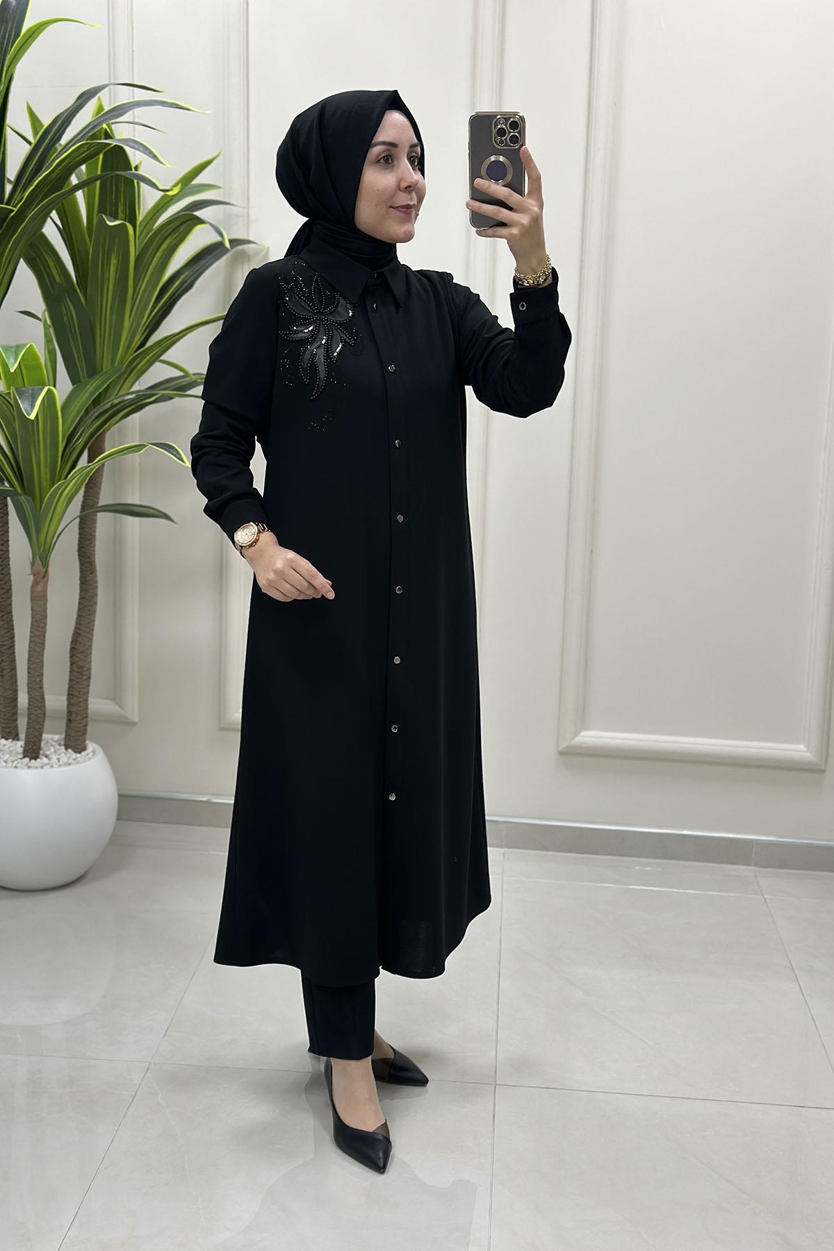 Önü Düğmeli İnci Nakış Detaylı Kadın Tunik Siyah CNR 2211 (CNR-26K2211)