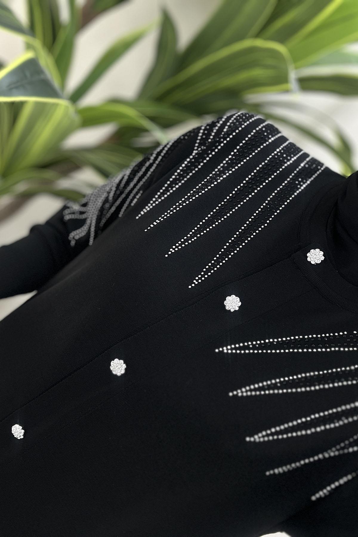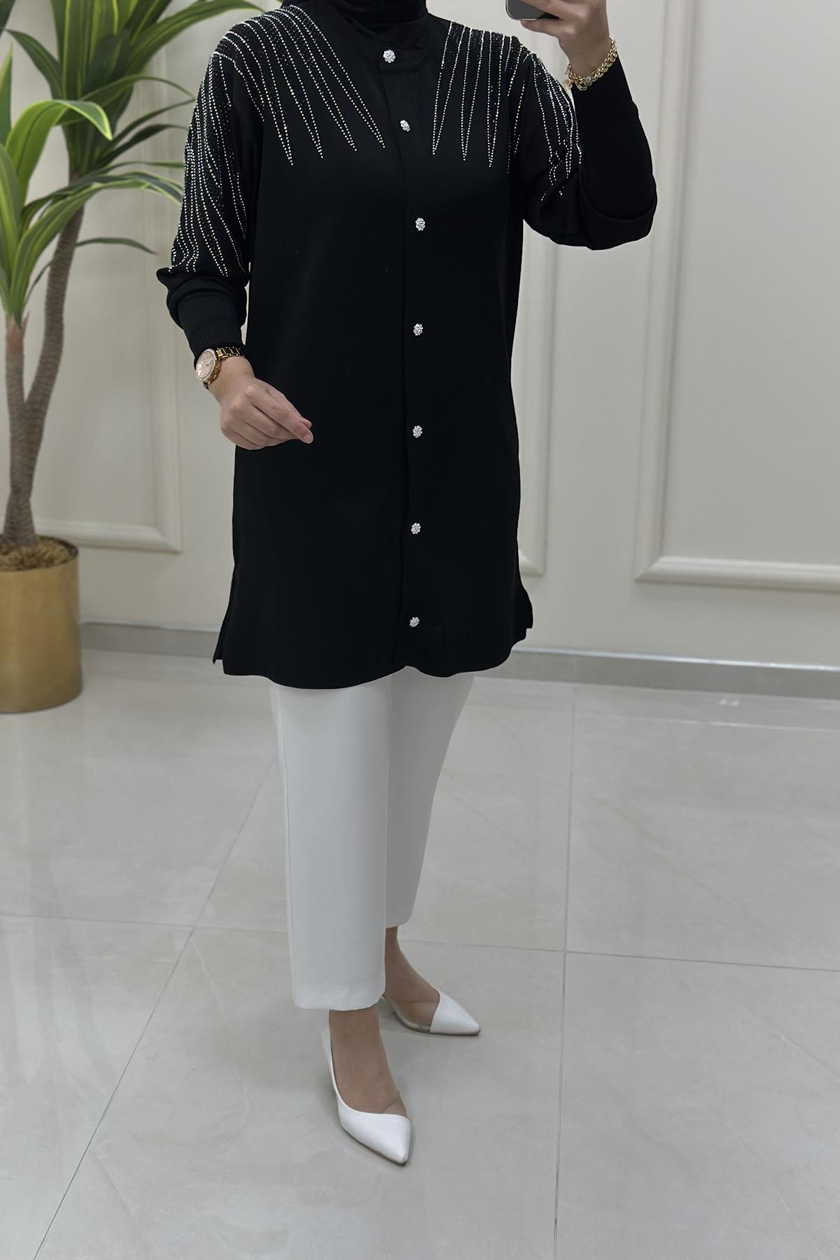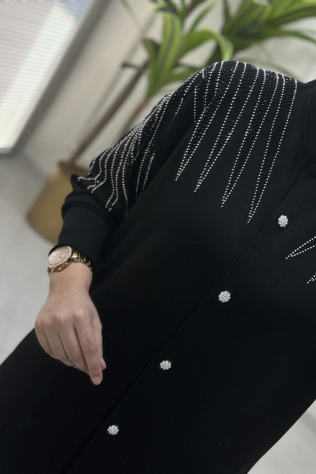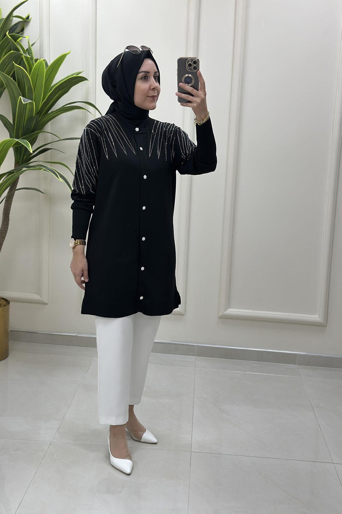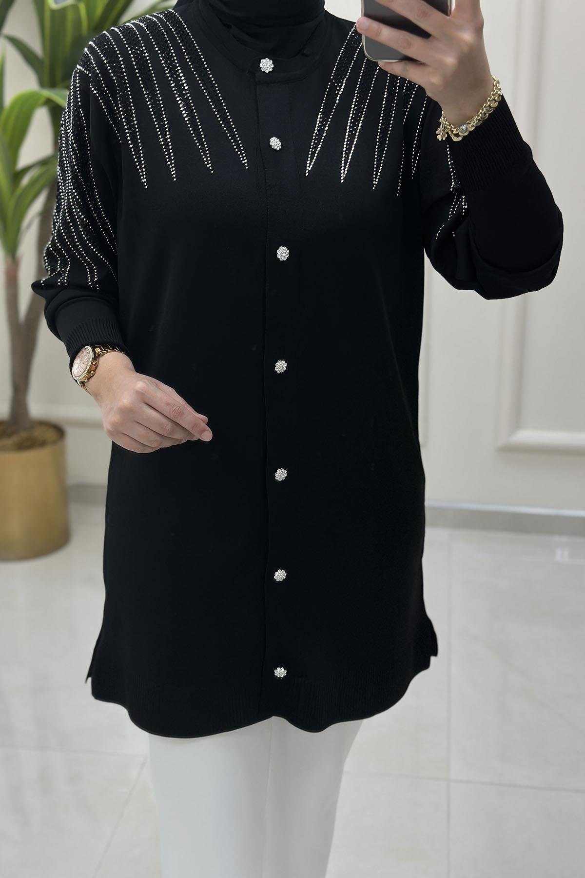 Önü Düğmeli Omuz Taş Baskılı Kadın Triko Hırka Siyah MLH 5034 (MLH-26K5034)