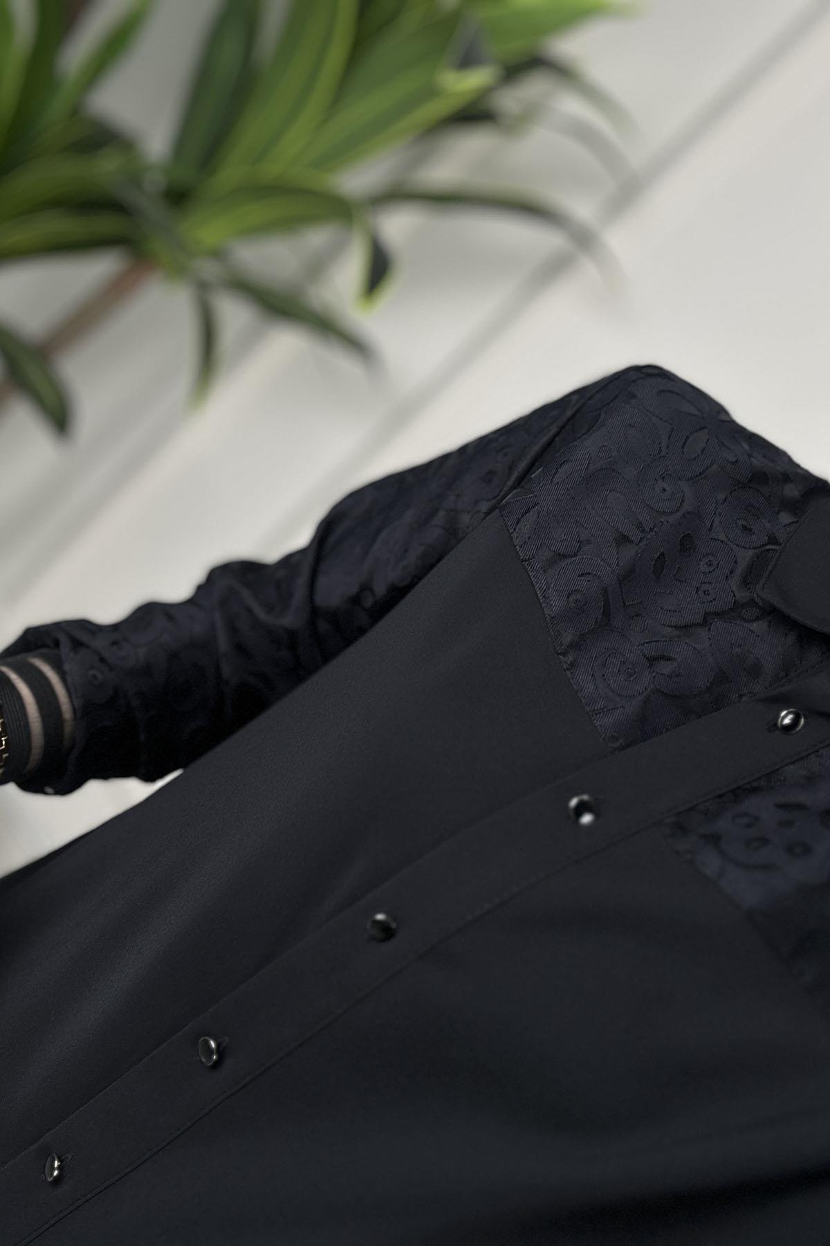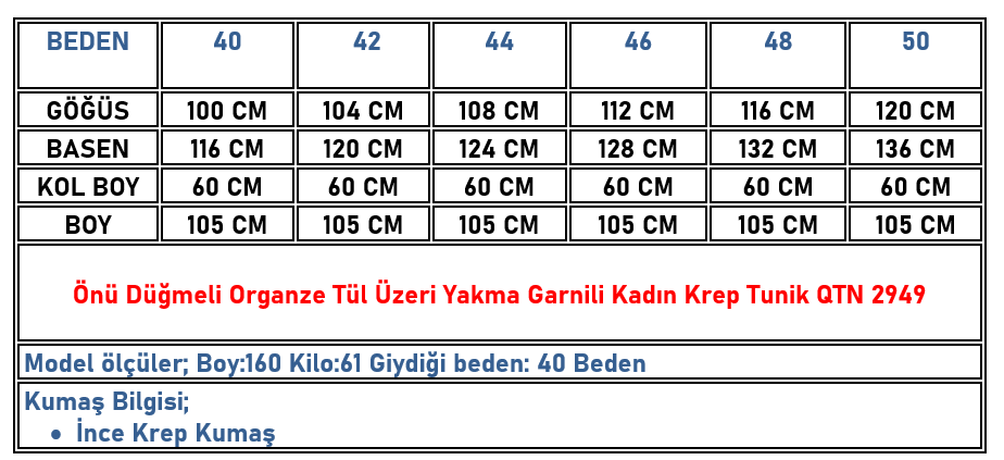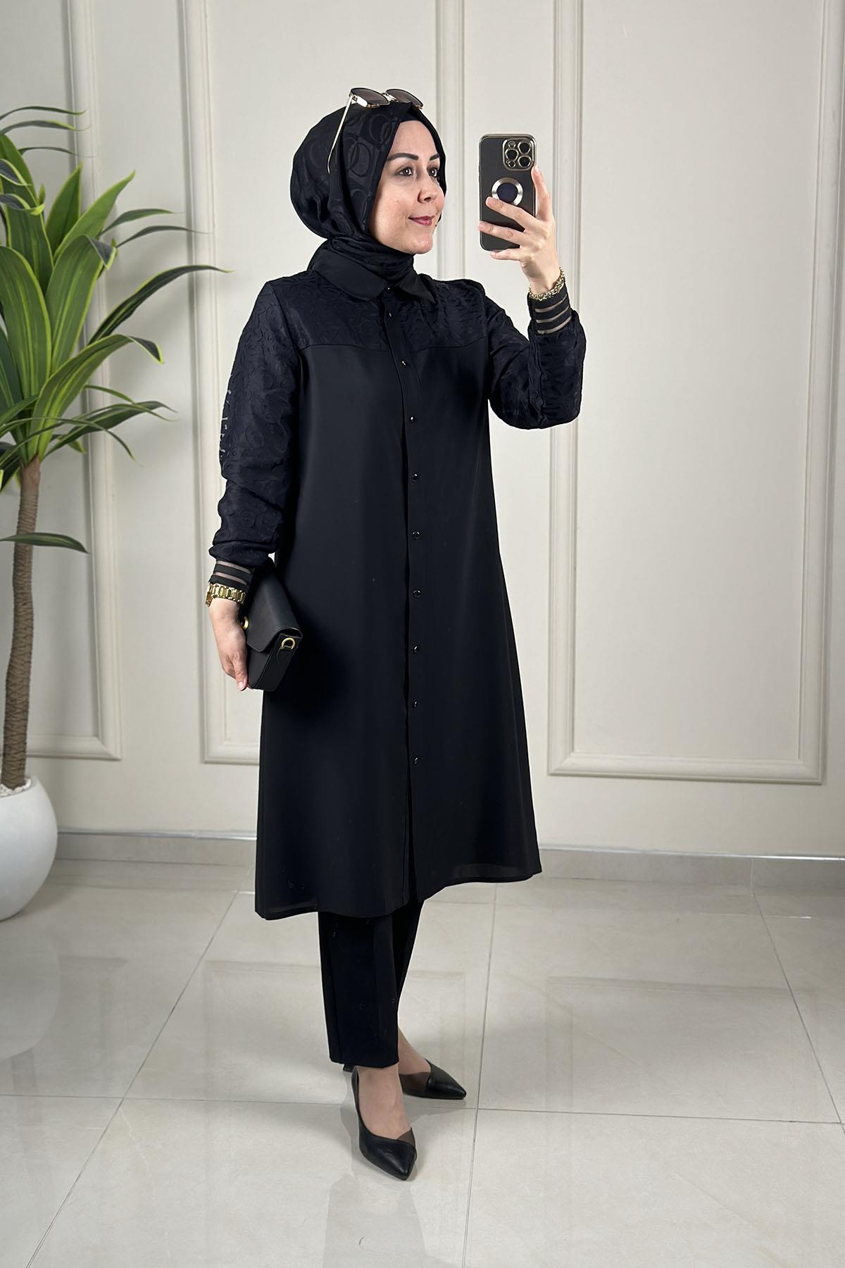 Önü Düğmeli Organze Tül Üzeri Yakma Garnili Kadın Krep Tunik Siyah QTN 2949 (QTN-26Y2949)