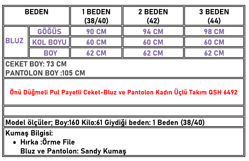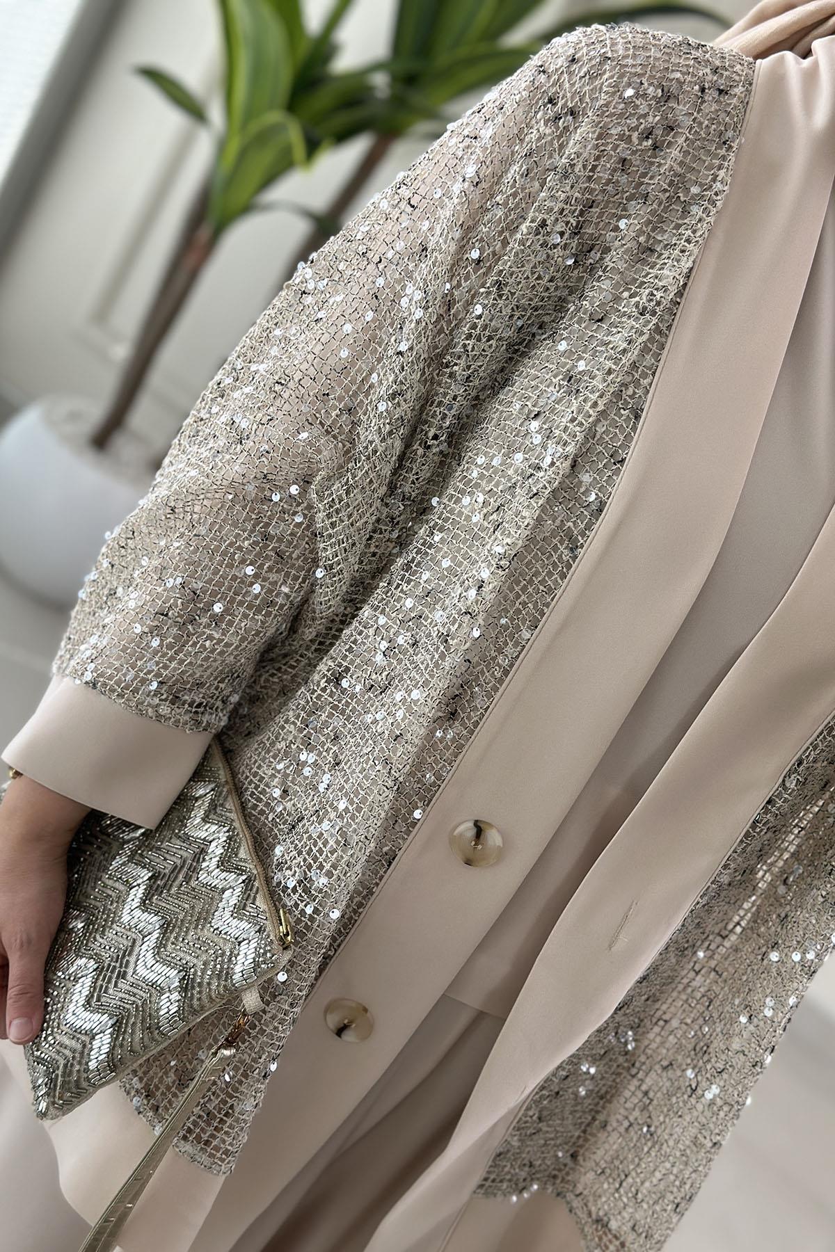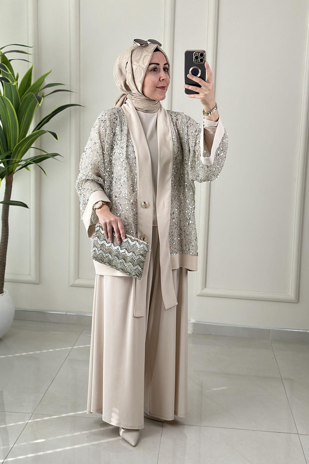 Önü Düğmeli Pul Payetli Ceket-Bluz ve Pantolon Kadın Üçlü Takım Bej QSH 6492 (QSH-26K6492)