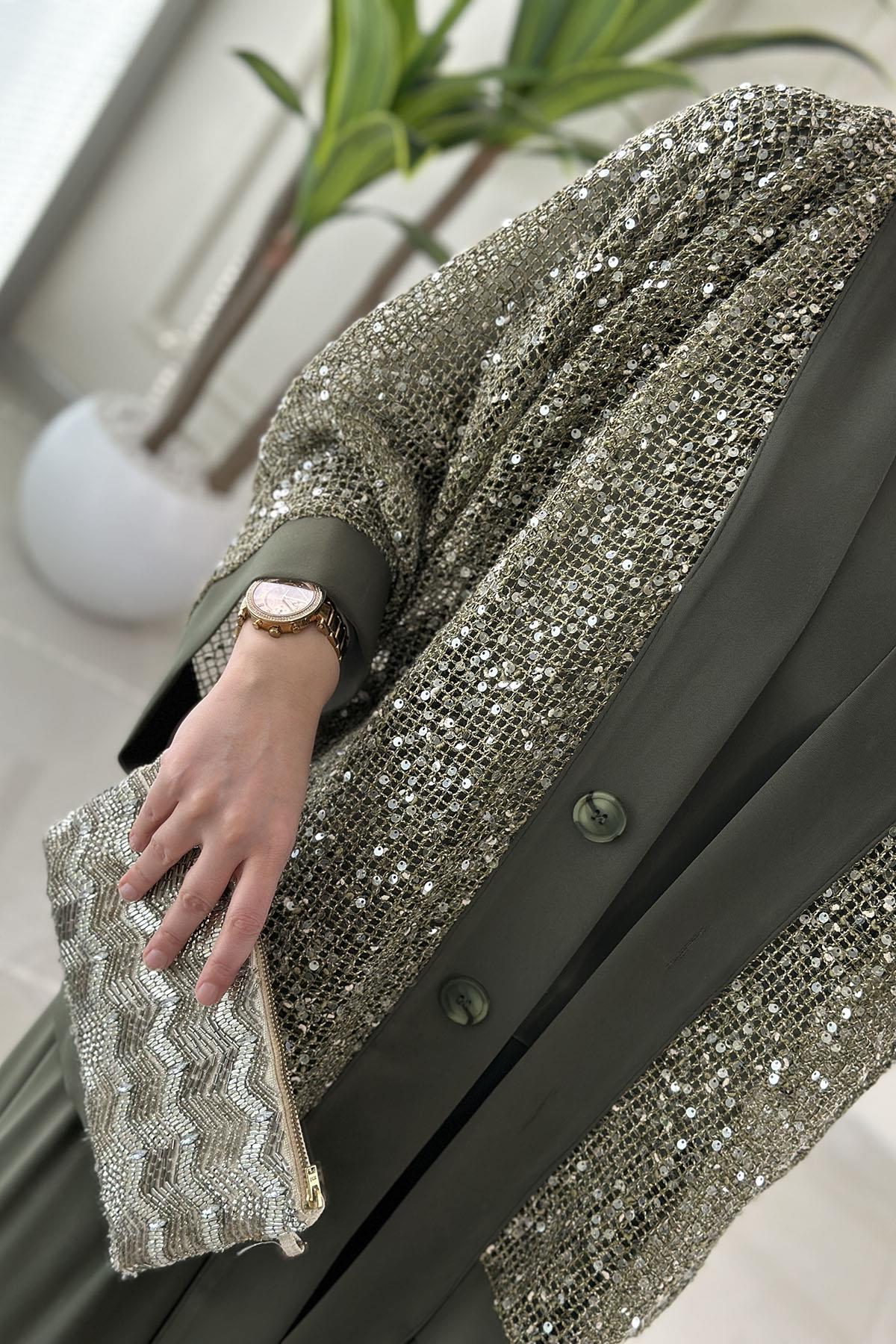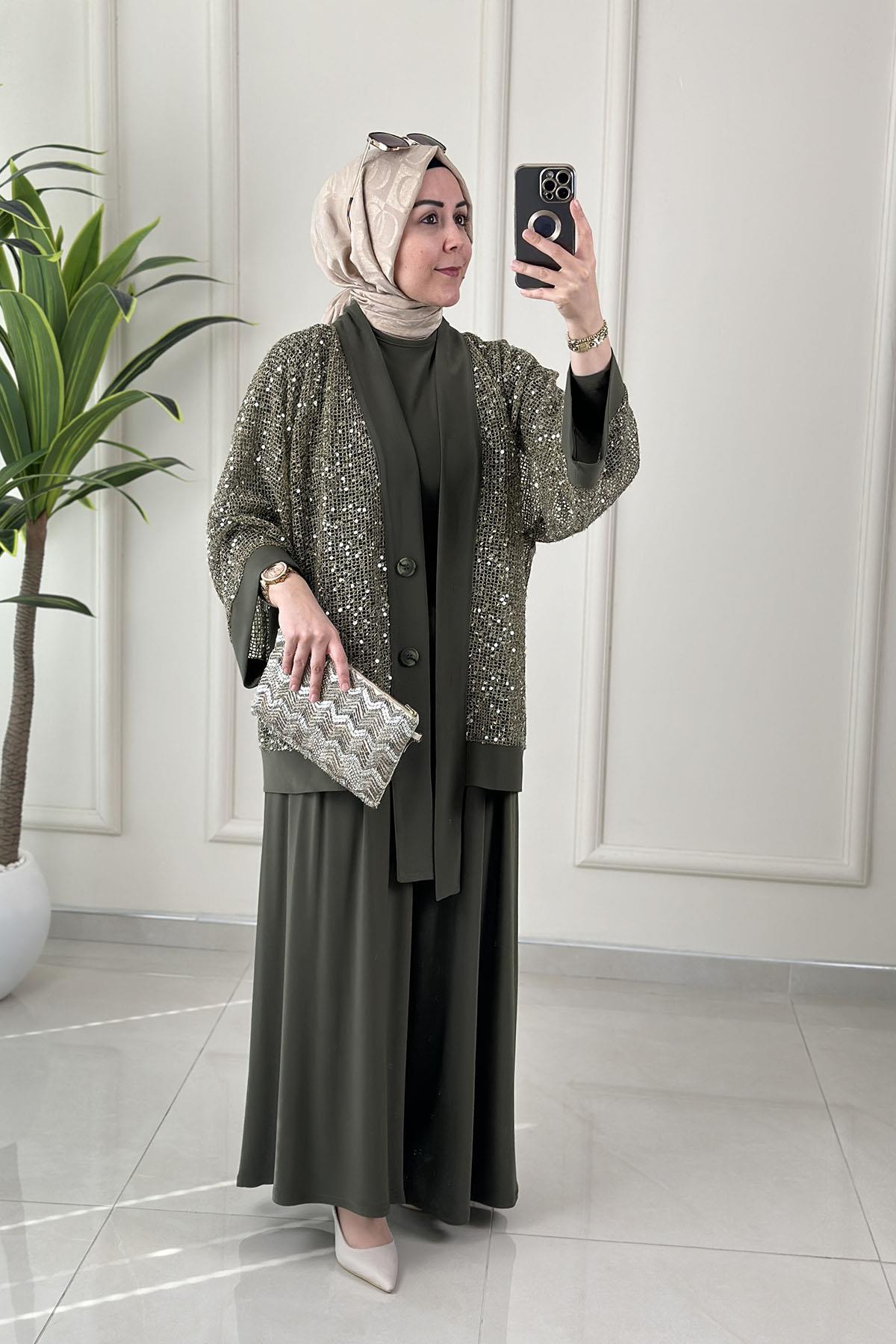 Önü Düğmeli Pul Payetli Ceket-Bluz ve Pantolon Kadın Üçlü Takım Haki QSH 6492 (QSH-26K6492)