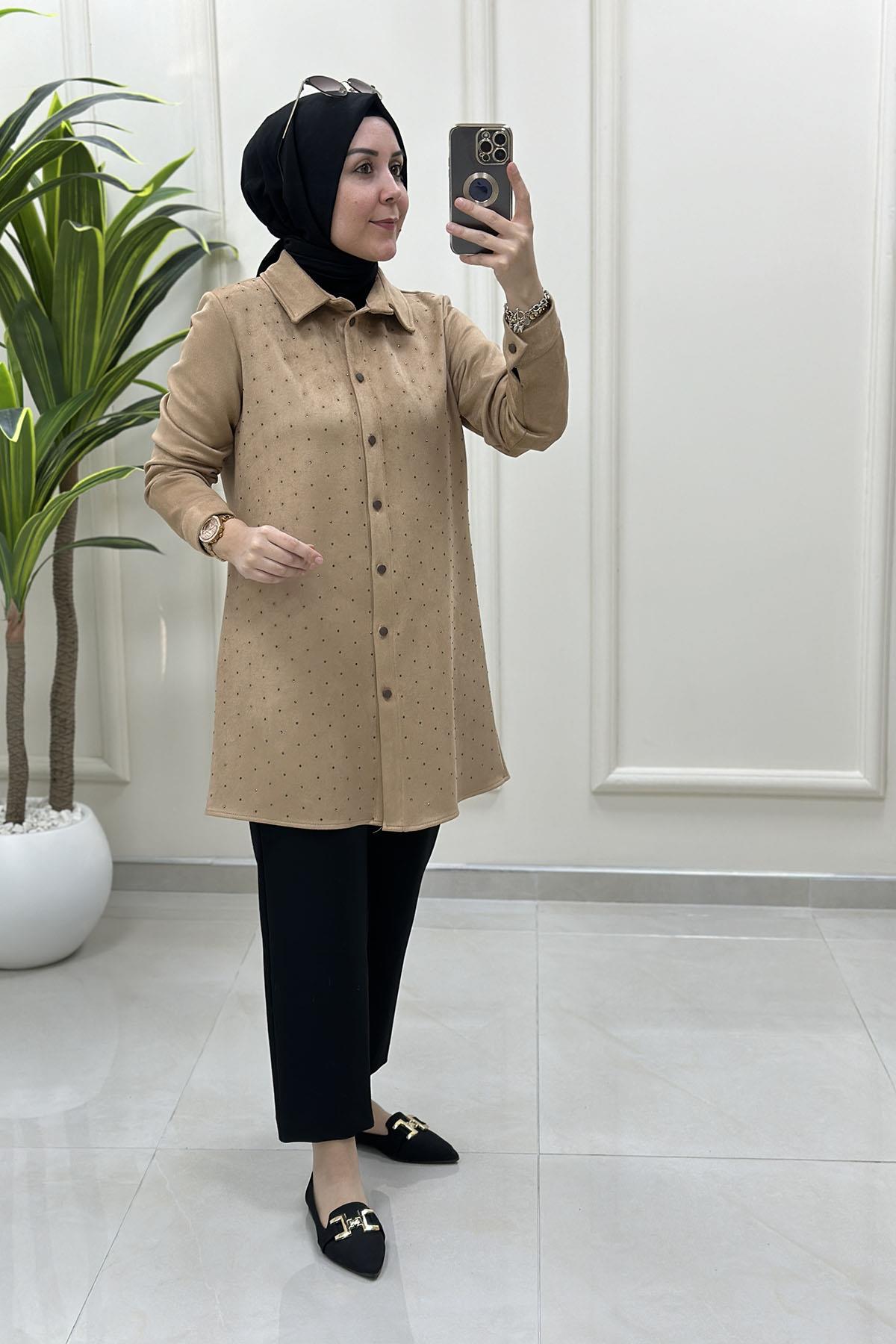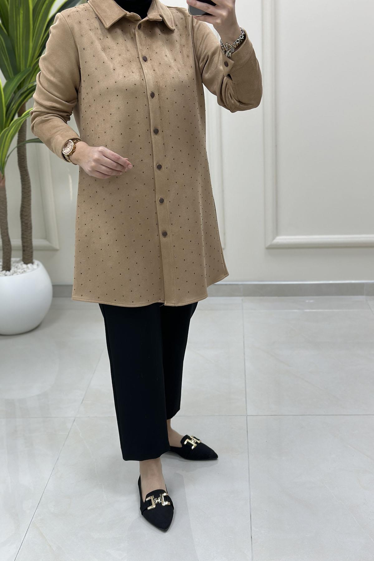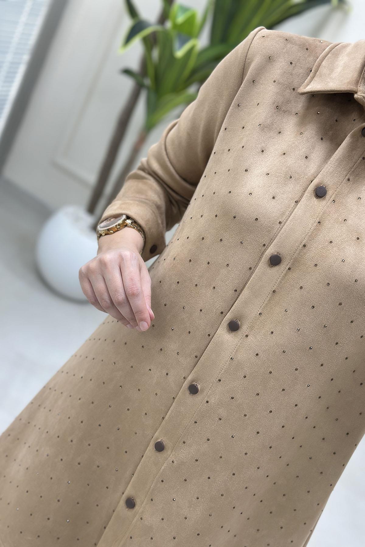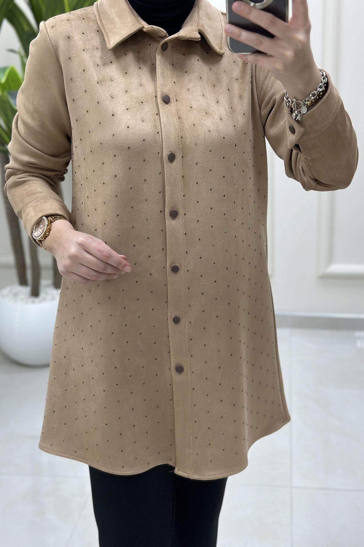 Önü Düğmeli Serpme Taş Detaylı Kadın Süet Tunik Bej BRL 7215 (BRL-26K7215)