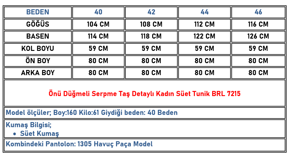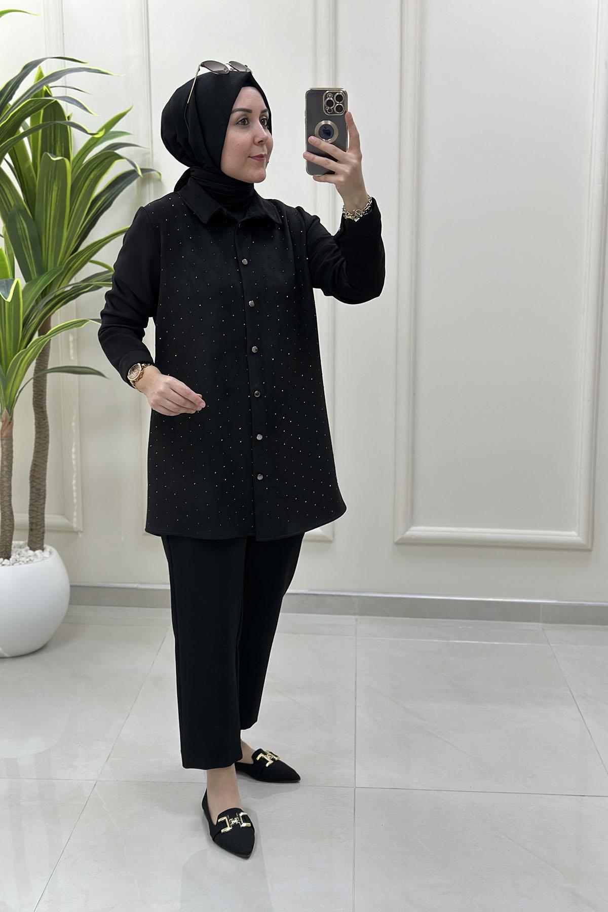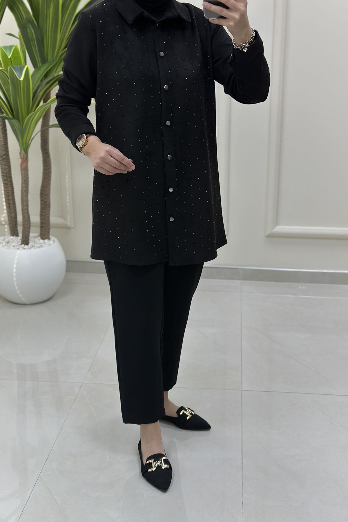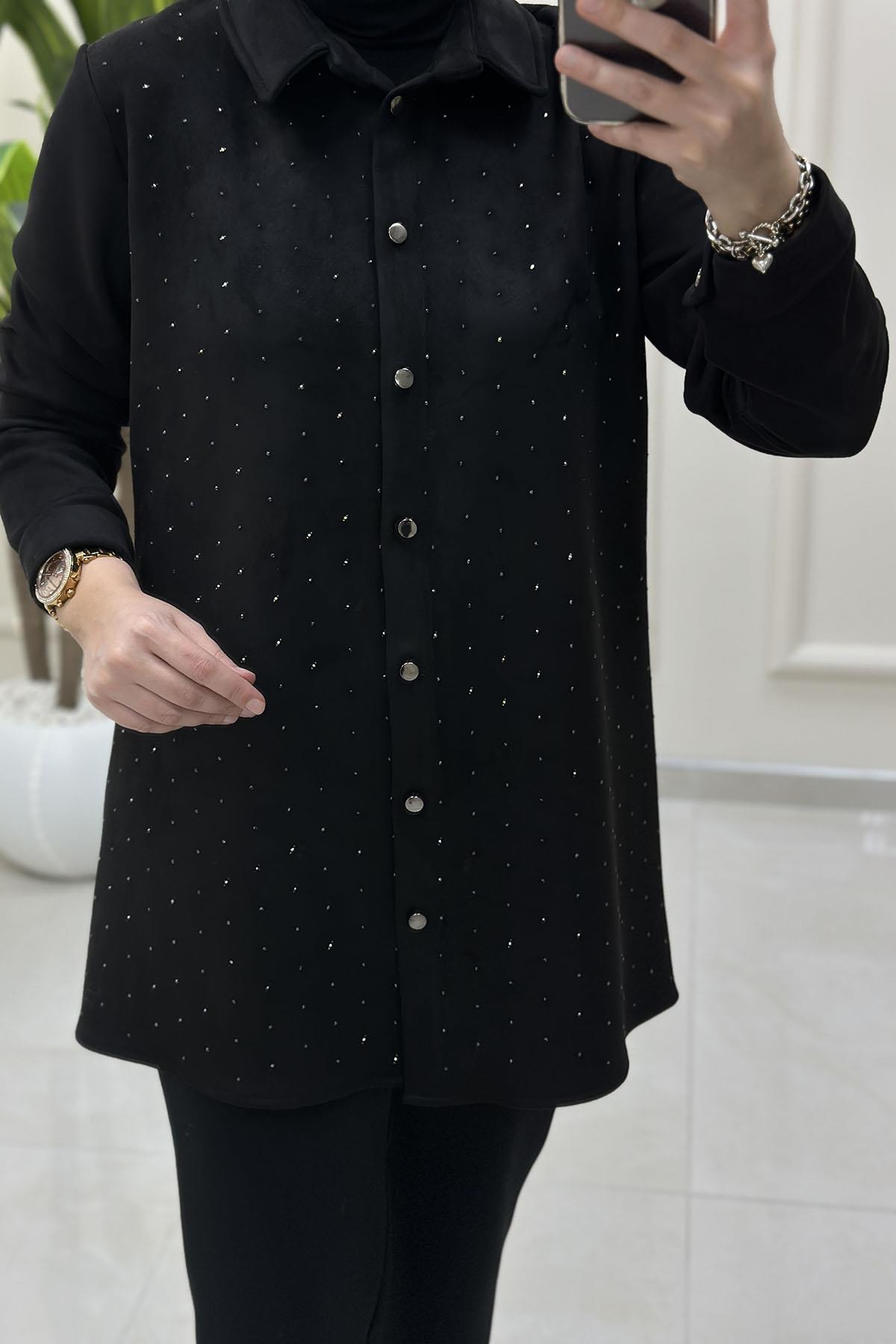 Önü Düğmeli Serpme Taş Detaylı Kadın Süet Tunik Siyah BRL 7215 (BRL-26K7215)