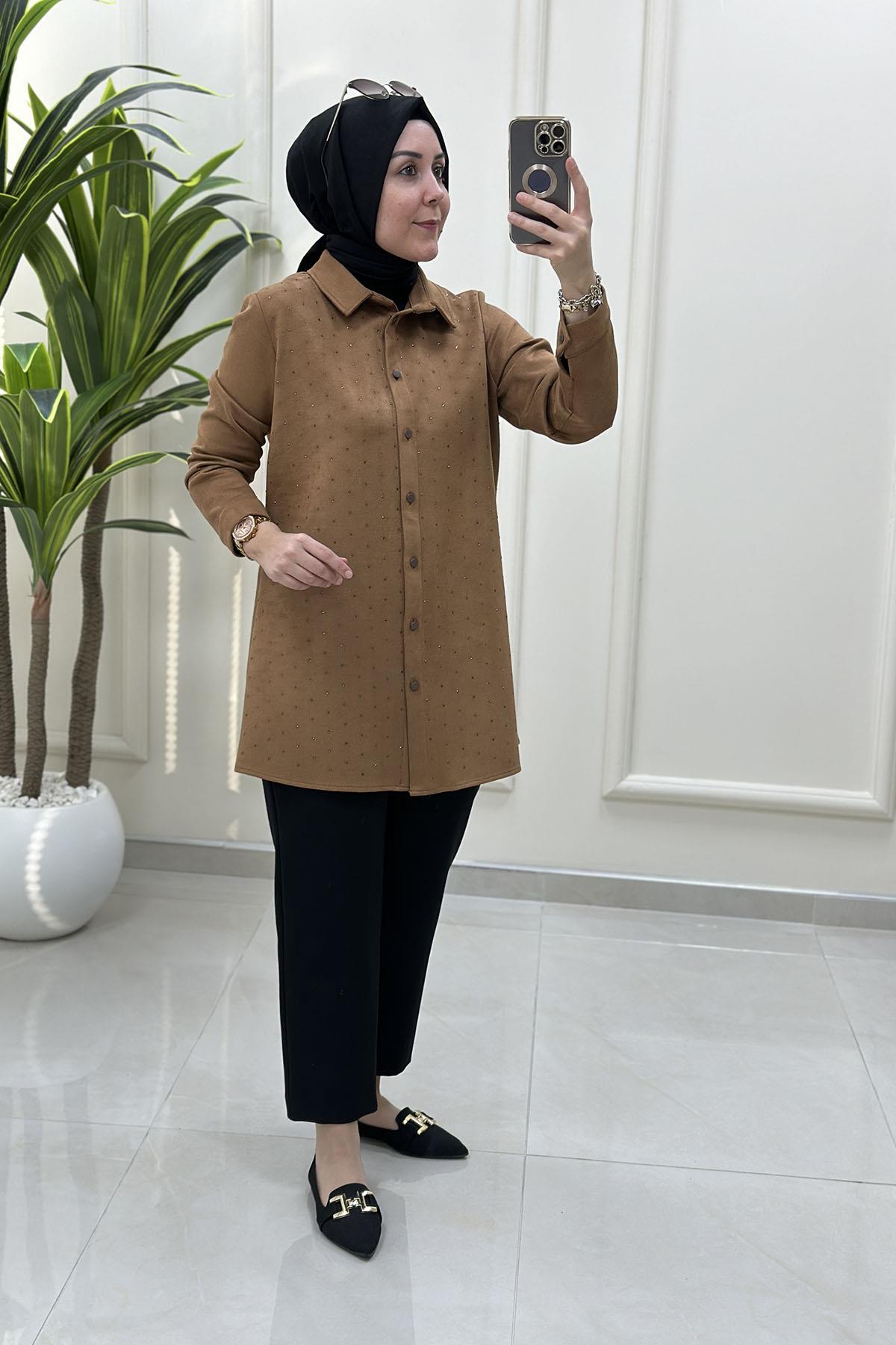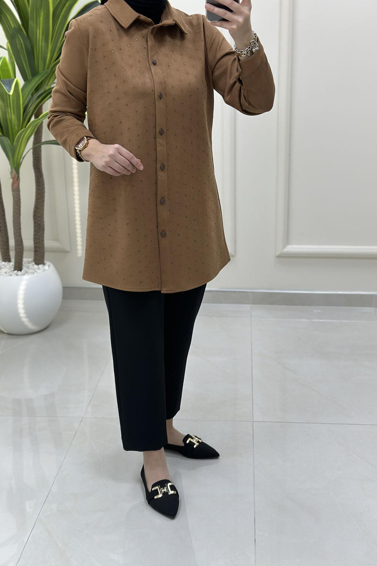 Önü Düğmeli Serpme Taş Detaylı Kadın Süet Tunik Taba BRL 7215 (BRL-26K7215)