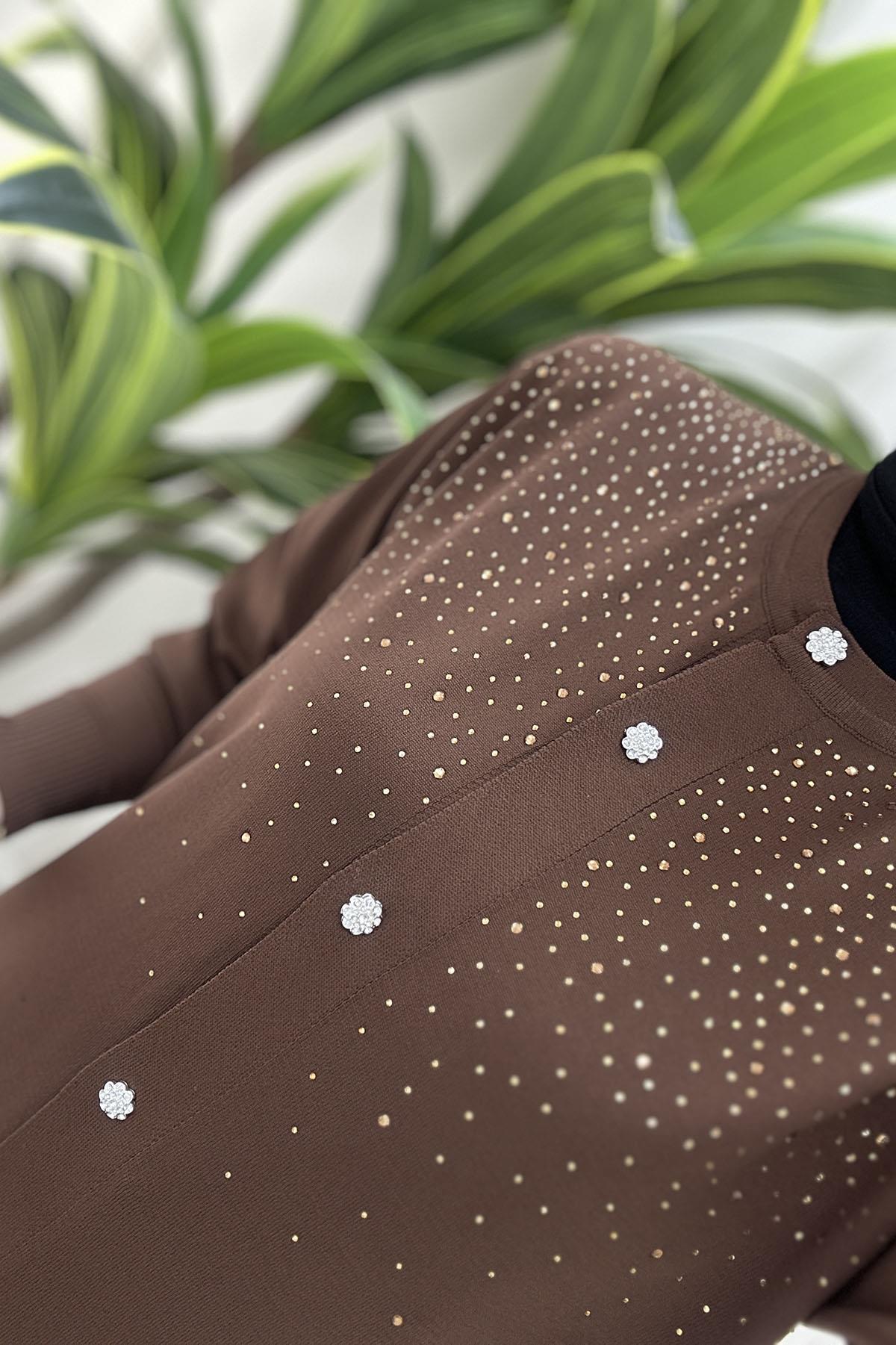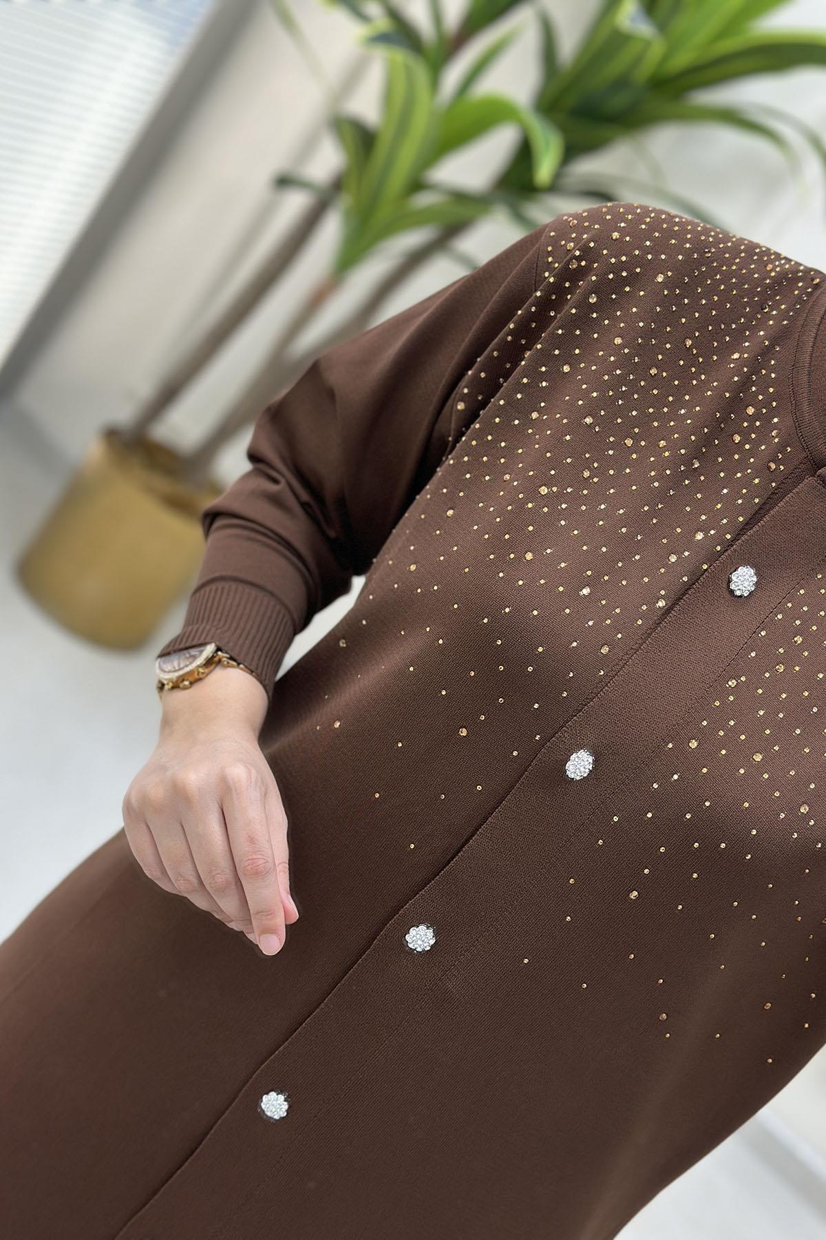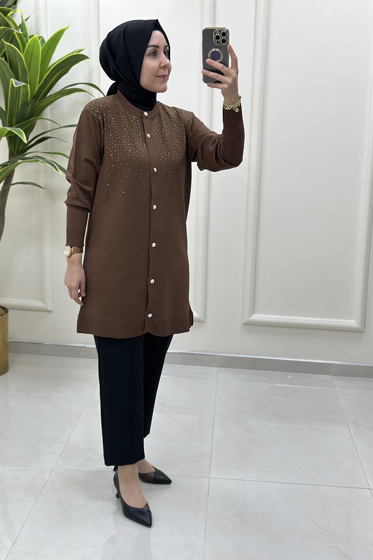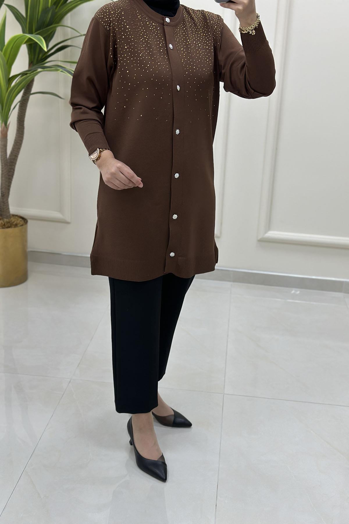 Önü Düğmeli Serpme Taş Detaylı Kadın Triko Hırka Kahverengi MLH 5007 (MLH-26K5007)