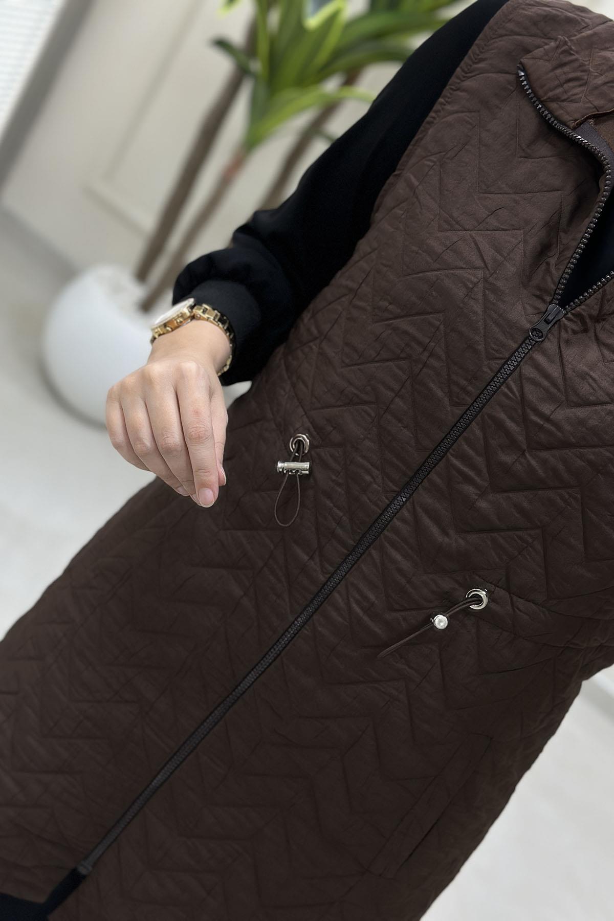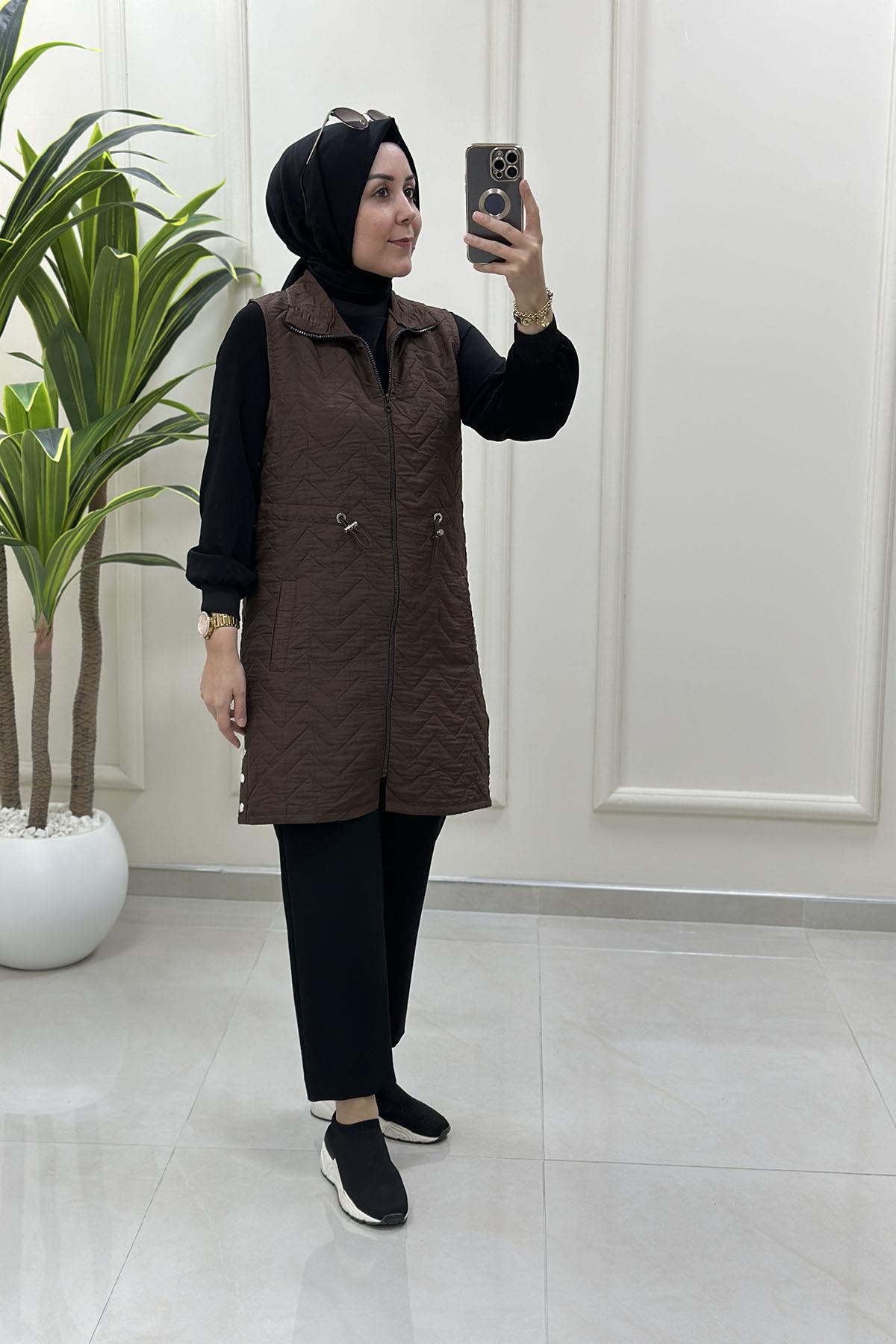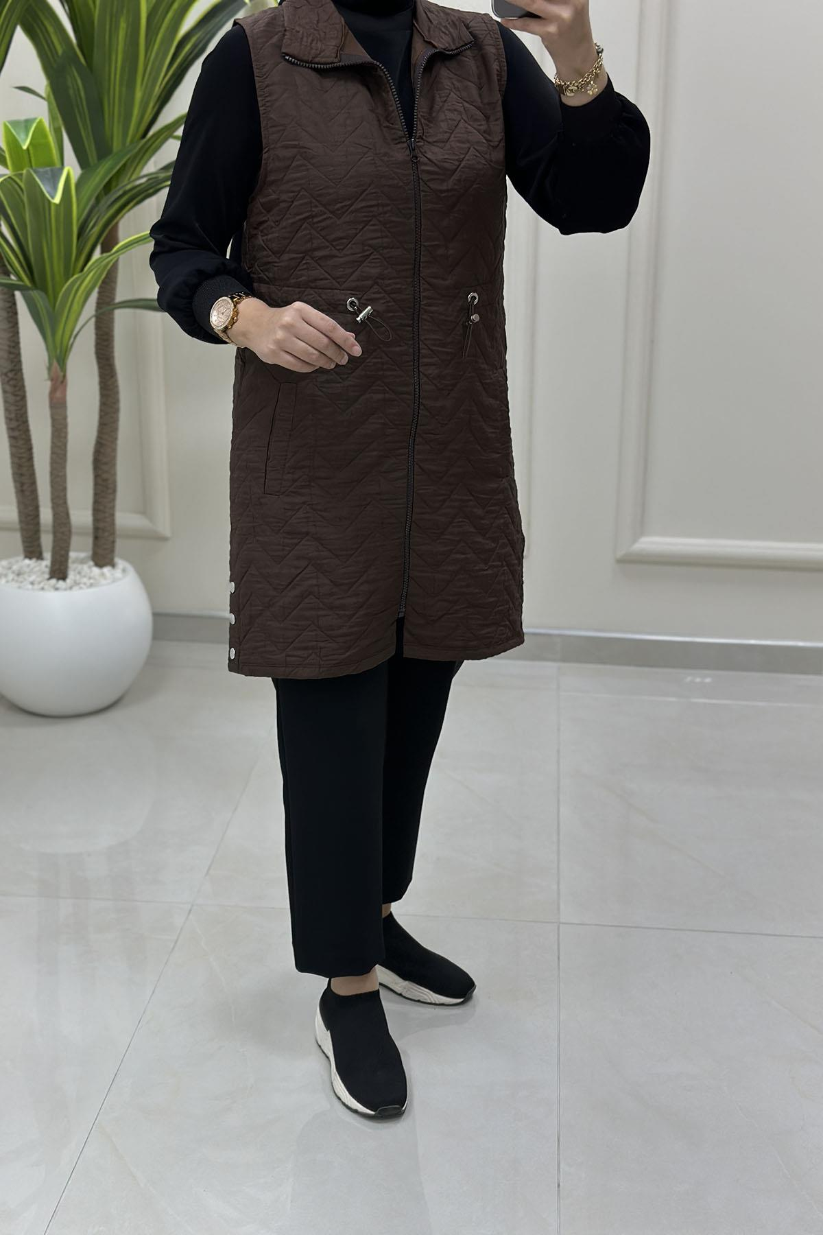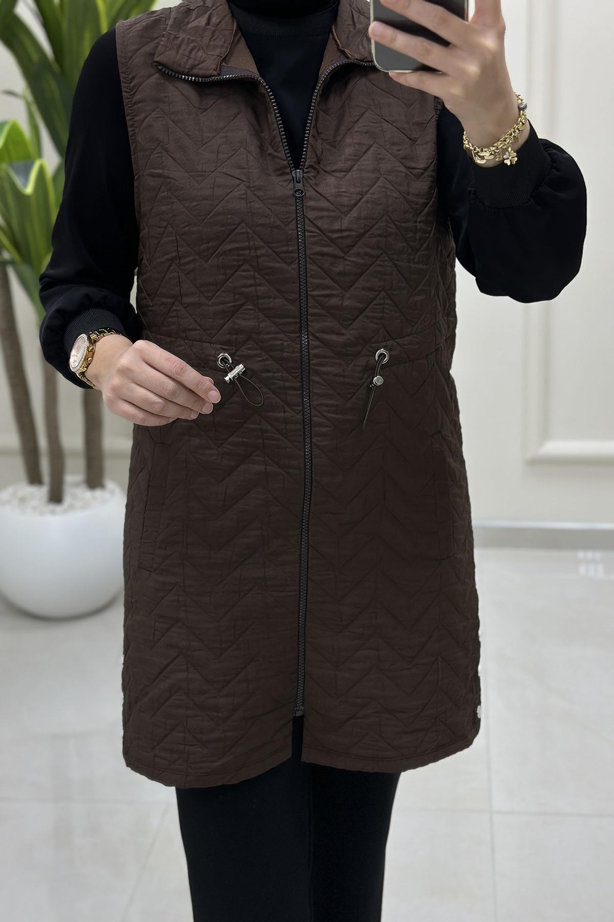 Önü Fermuarlı Beli Büzgülü Kadın Kapitone Yelek Kahverengi GNR 217 (GNR-26K217)