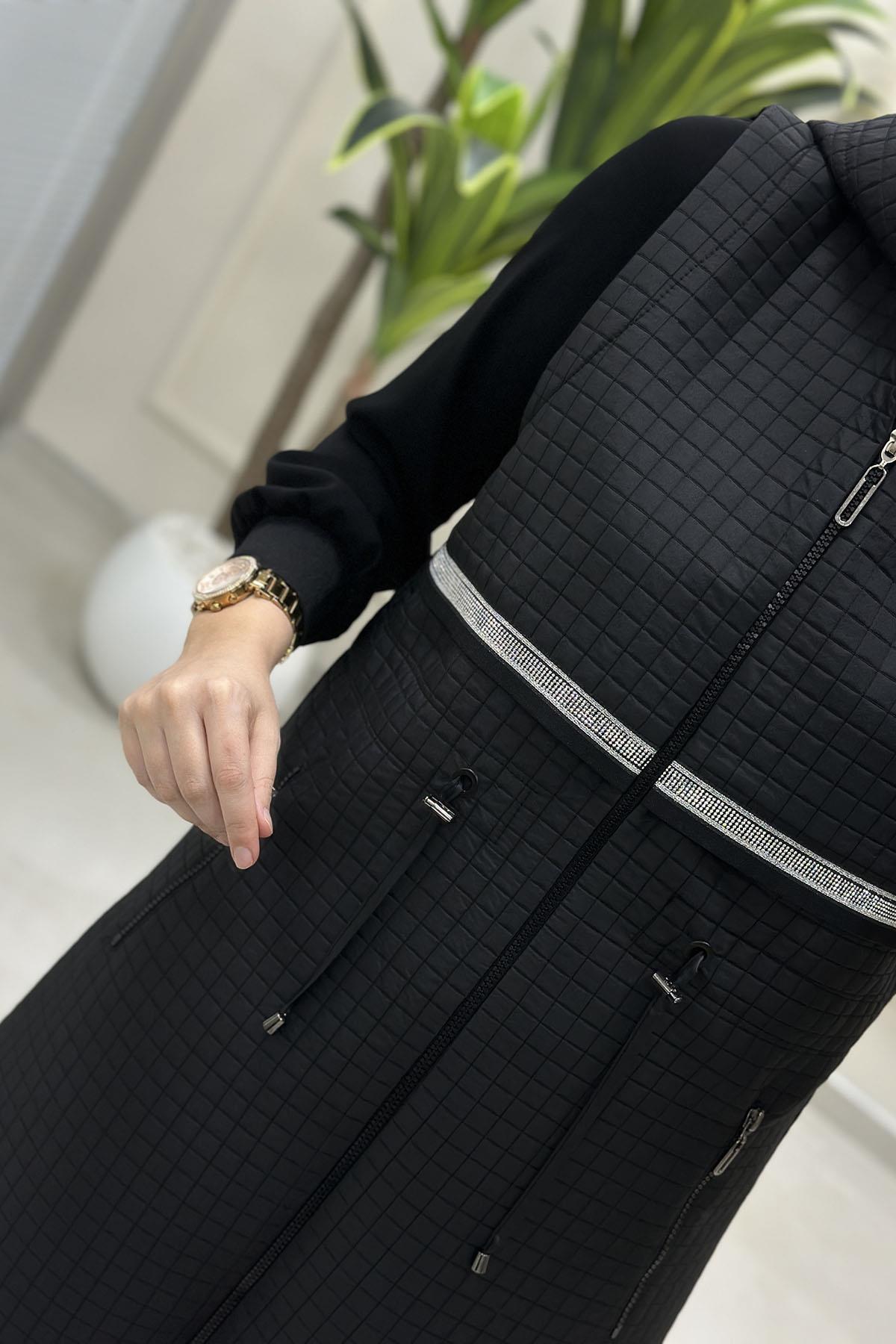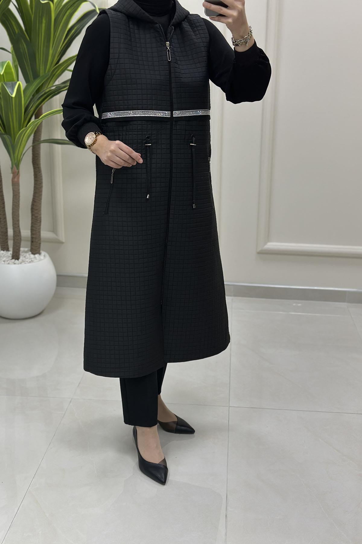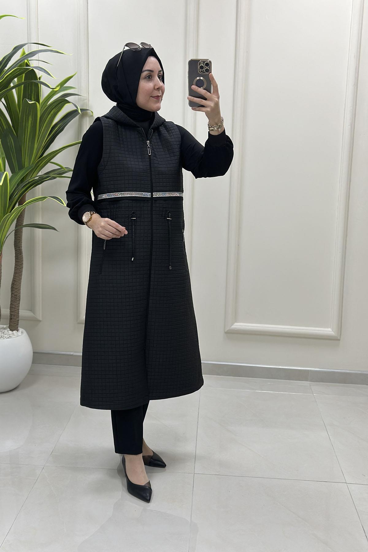 Önü Fermuarlı Biye Taş Detaylı Kadın Kapitone Yelek Siyah MLH 4527 (MLH-26K4527)