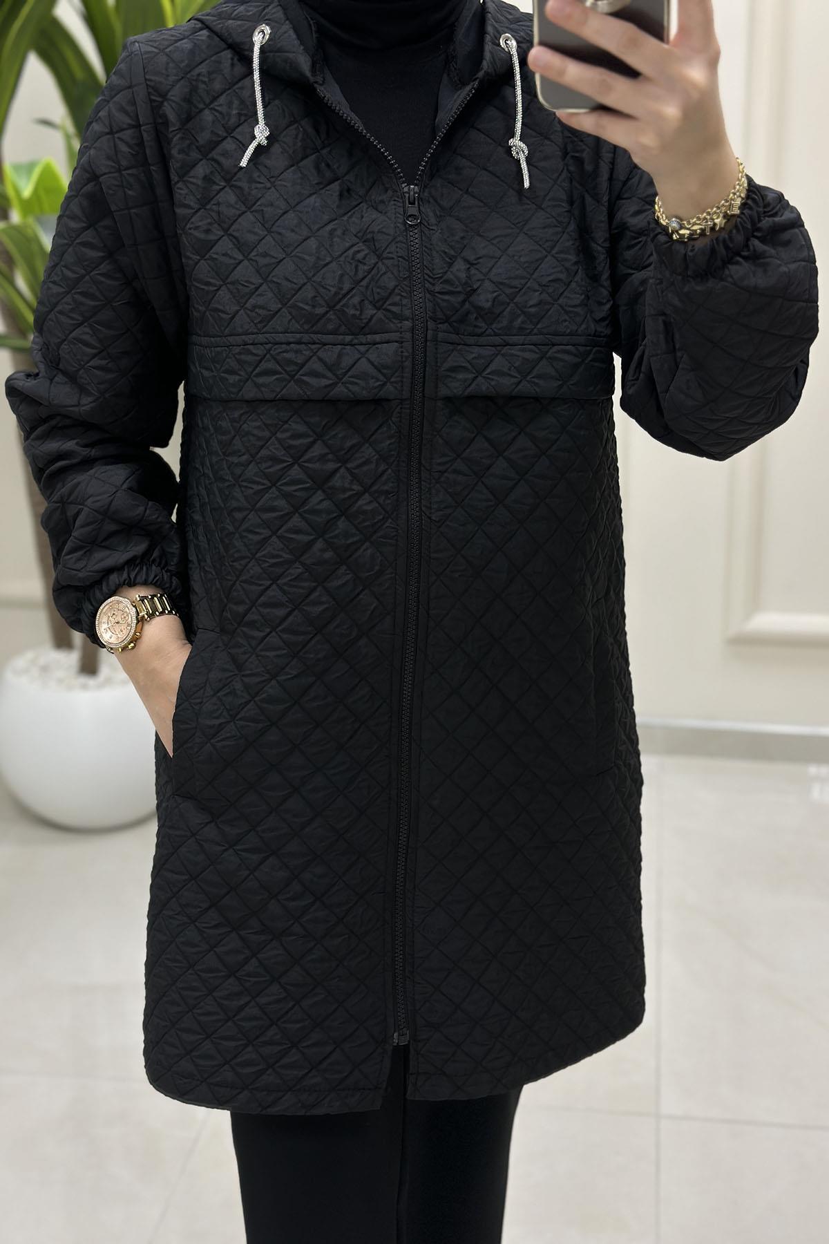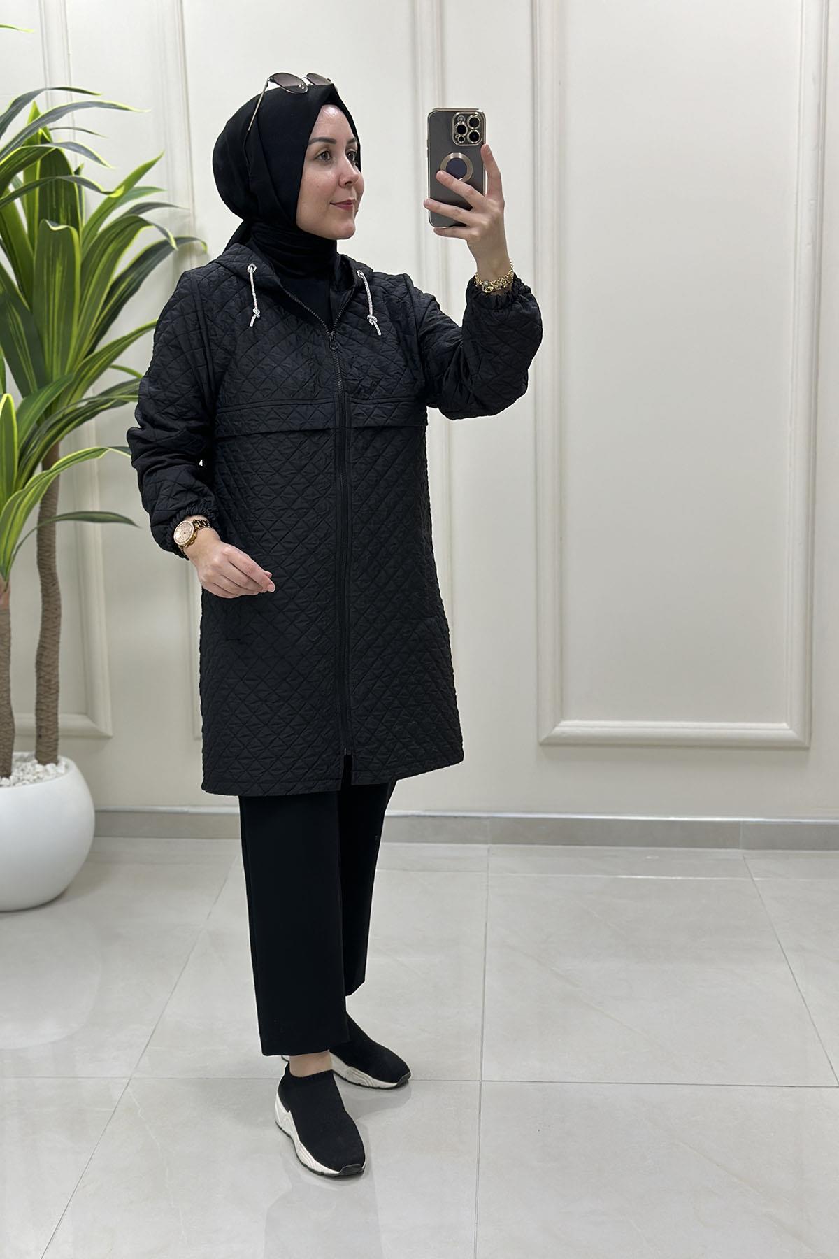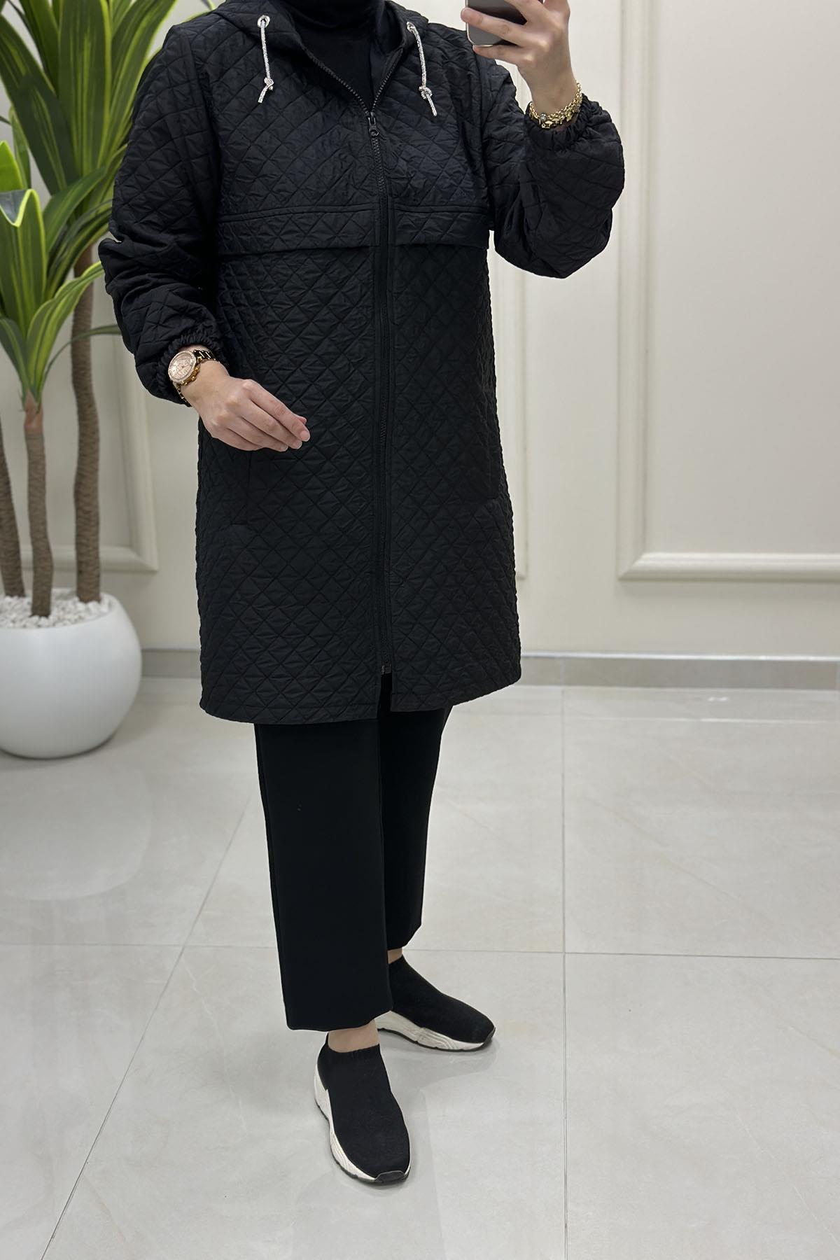 Önü Fermuarlı Cepli Kolu Büzgülü Kadın Kapitone Giyçık Siyah GNR 219 (GNR-26K219)