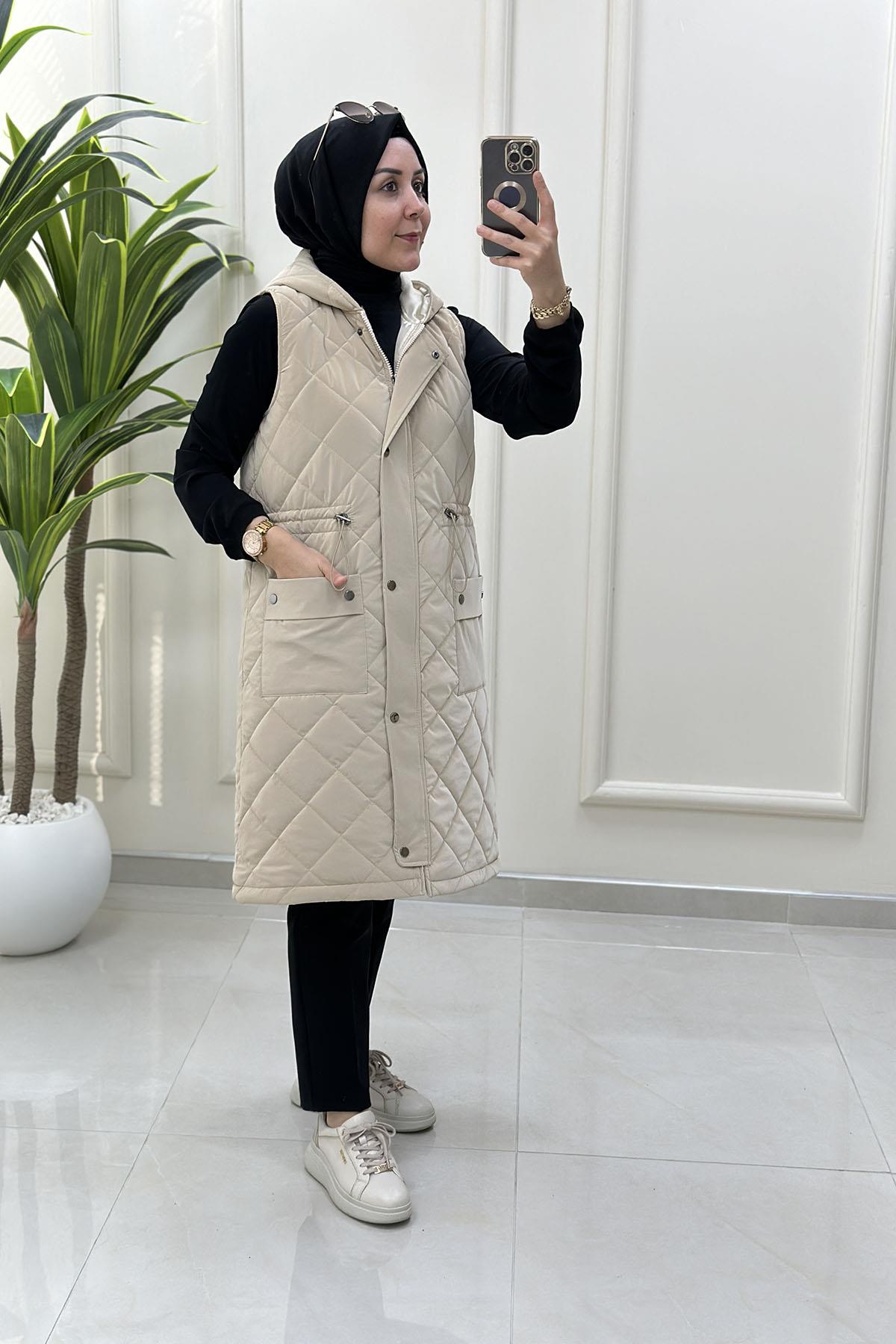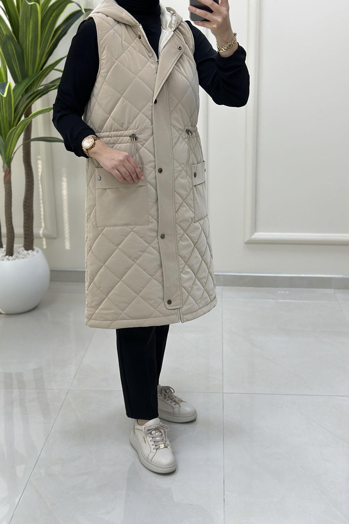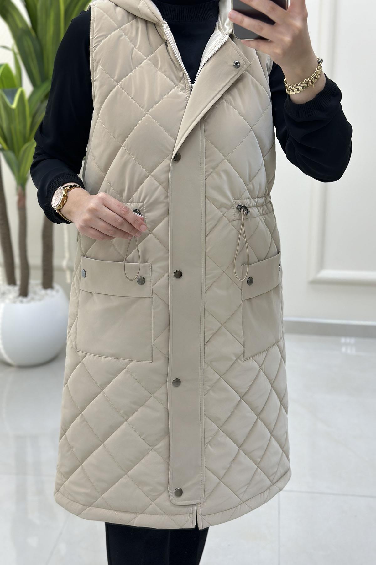 Önü Fermuarlı Çıtçıtlı Cepli Kadın Şişme Yelek Bej MLH 4514 (MLH-26K4514)
