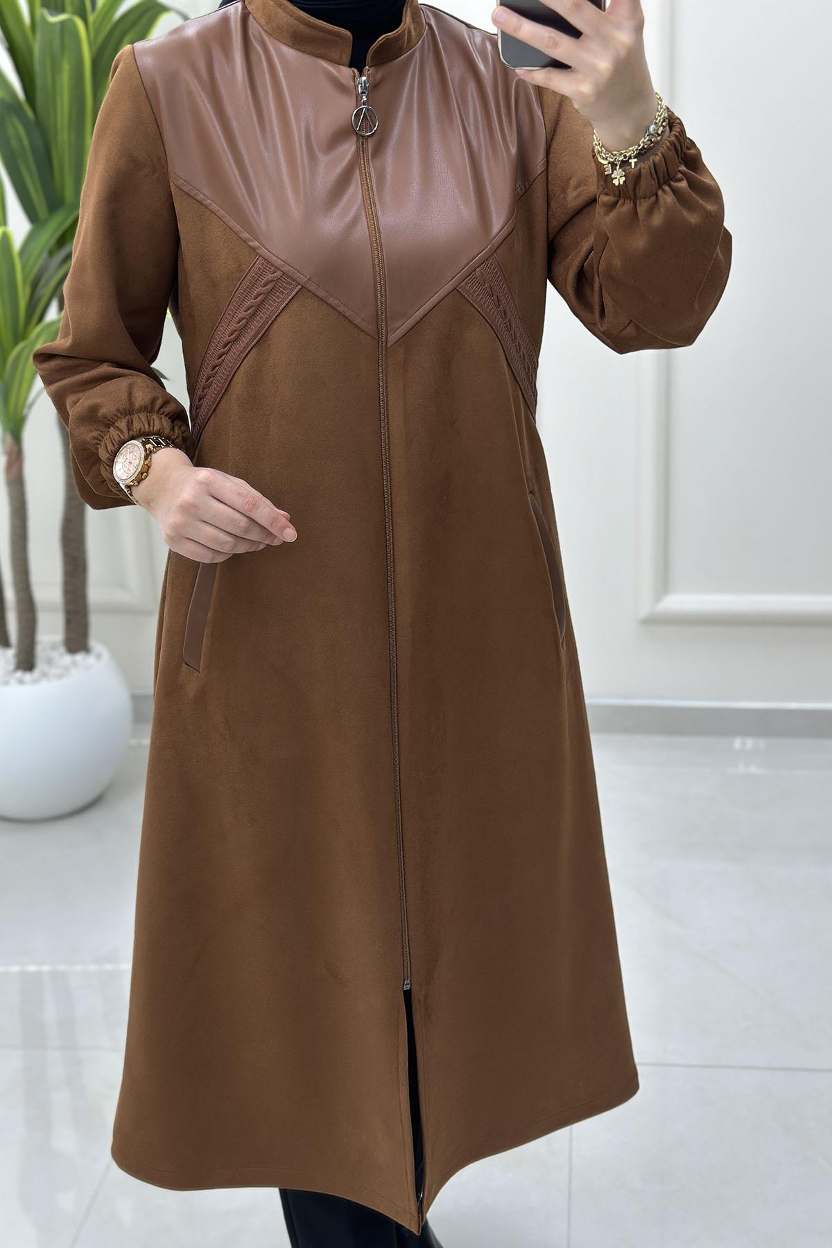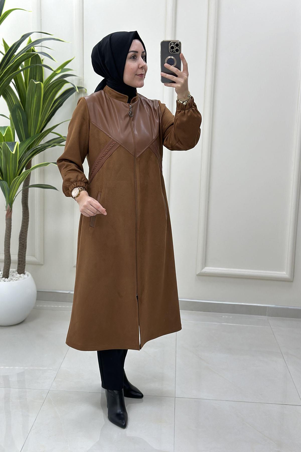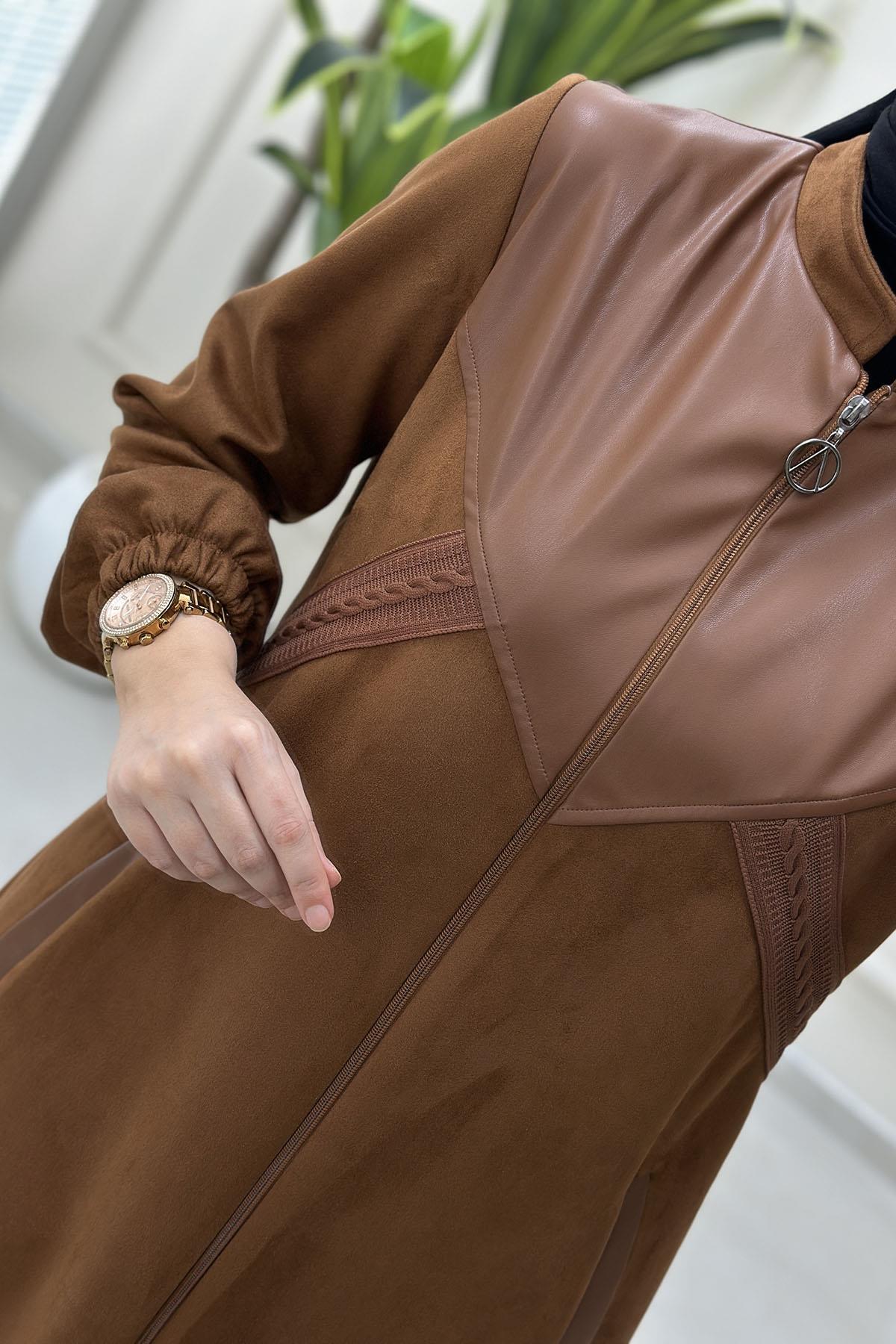 Önü Fermuarlı Deri Kombinli Kadın Süet Kap Taba BRL 6117 (BRL-26K6117)
